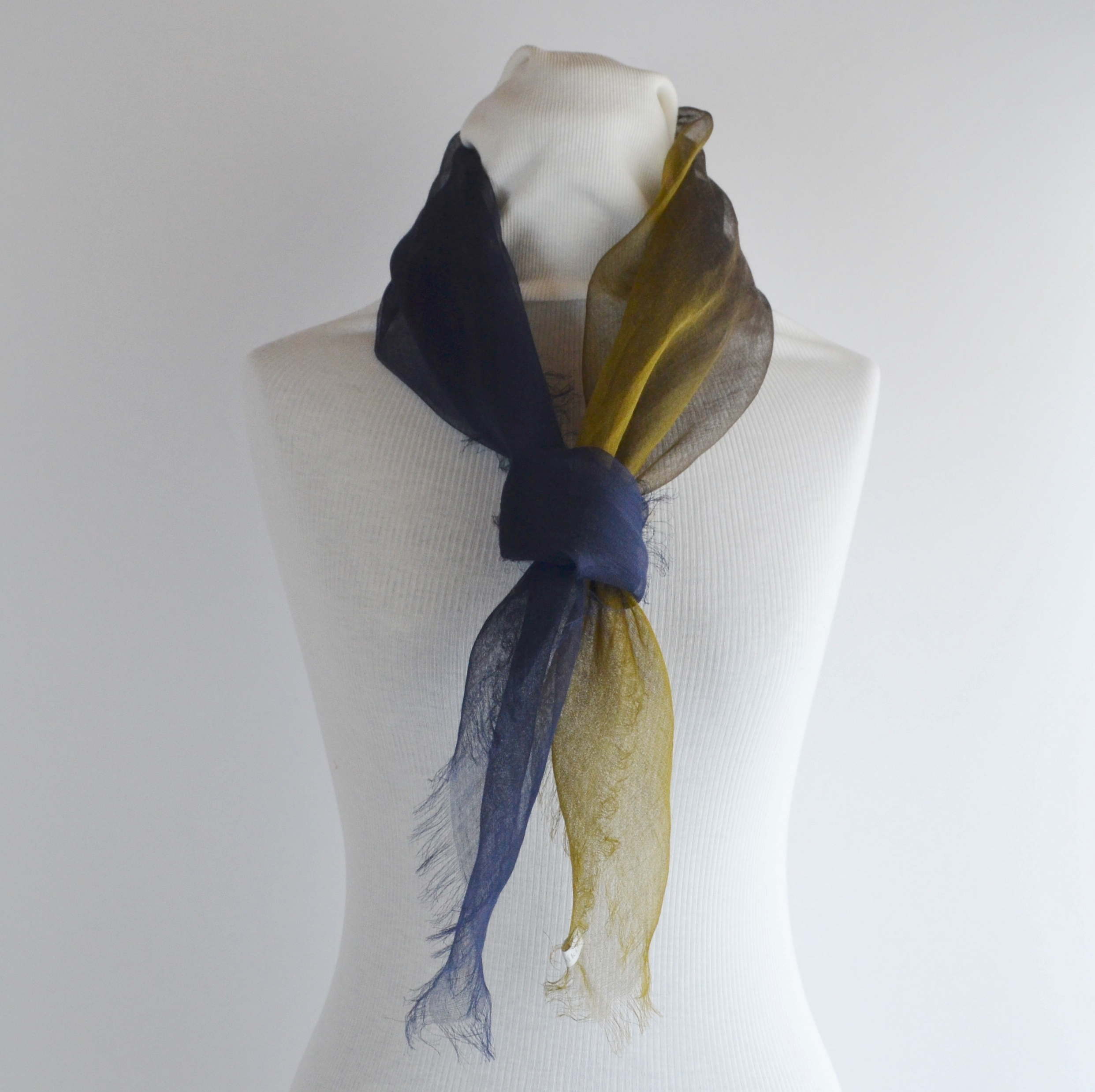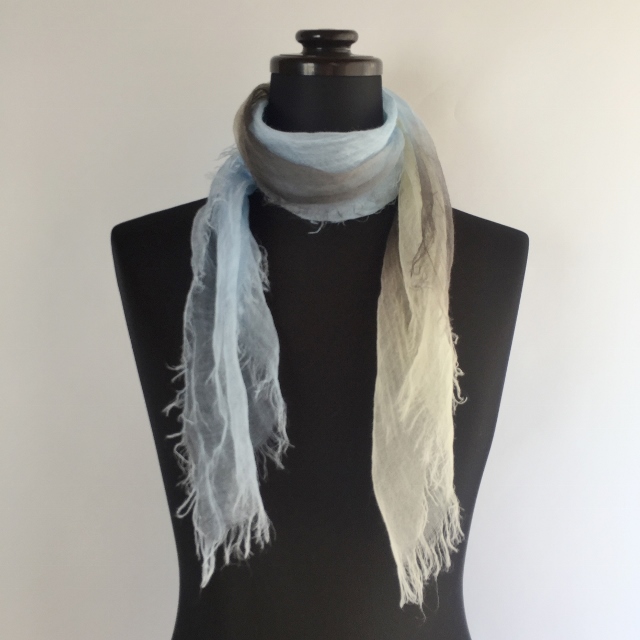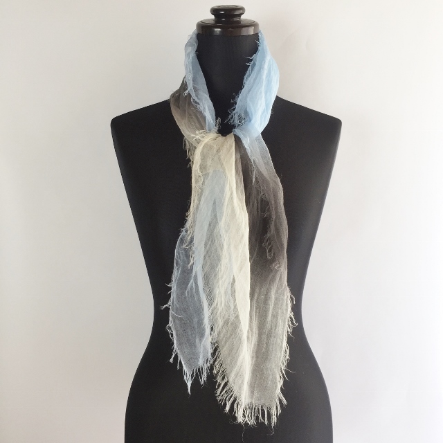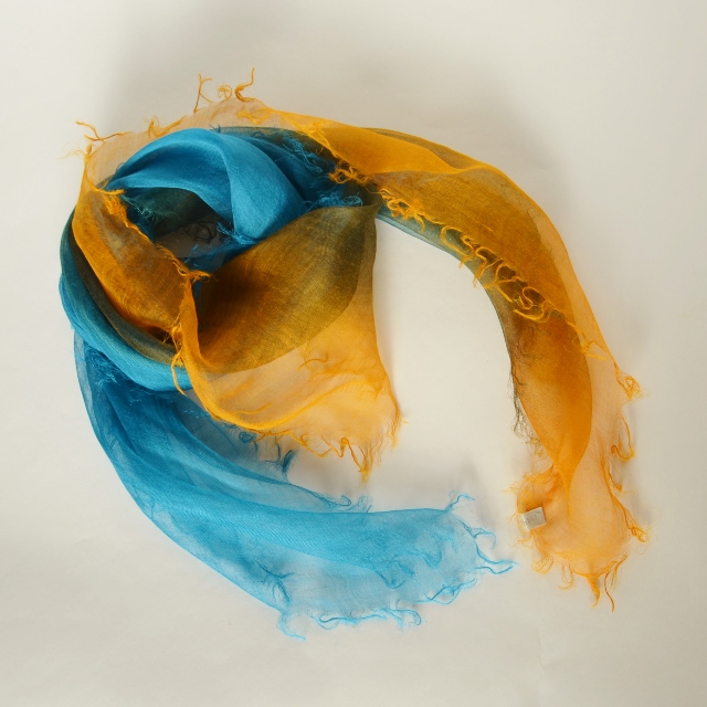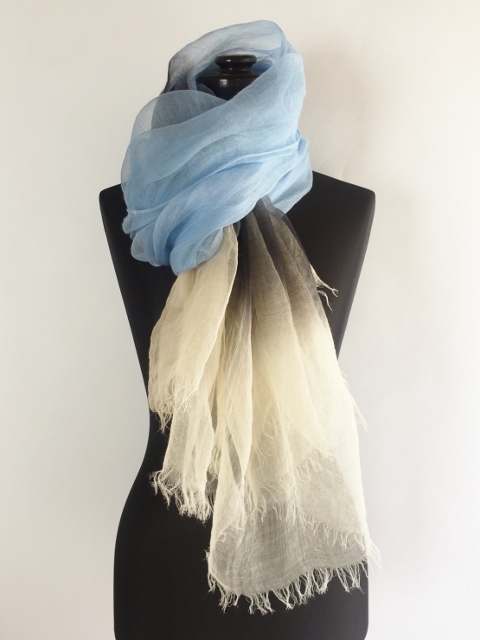 トンボの羽のように薄く透き通る麻100%の小さいストールです。日本製ならではの繊細さが魅力。手染めのグラデーションが美しくとてもエレンガントです。もらったらぜったい喜ばれるはず!