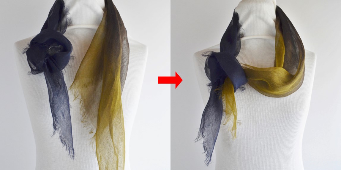 首にかけたストールの一片を一結びして輪を作り、その輪に「上から」もう片方を差し込みます。 (下の画像は『深縹』を使いました。)