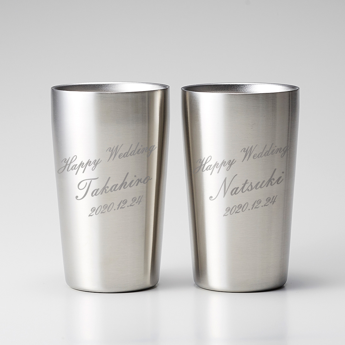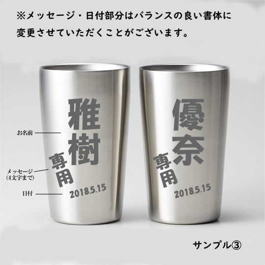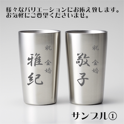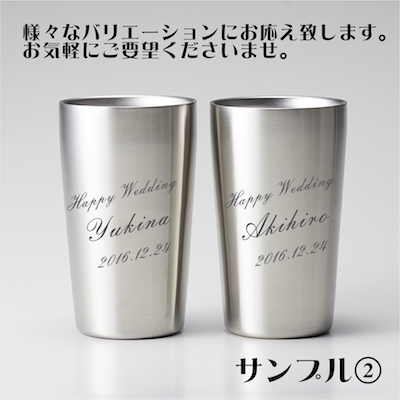 オプションで名前入れが可能! 世界にたった一つのオリジナルタンブラーのプレゼントは、喜んでもらえること間違いなしです。 カップルやご夫婦への結婚祝いとして、ぜひ贈り相手の名前や気持ちメッセージを入れてサプライズ感あるプレゼントを贈ってみてはいかがでしょうか?