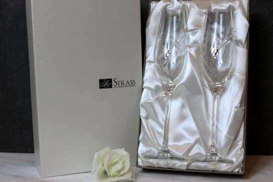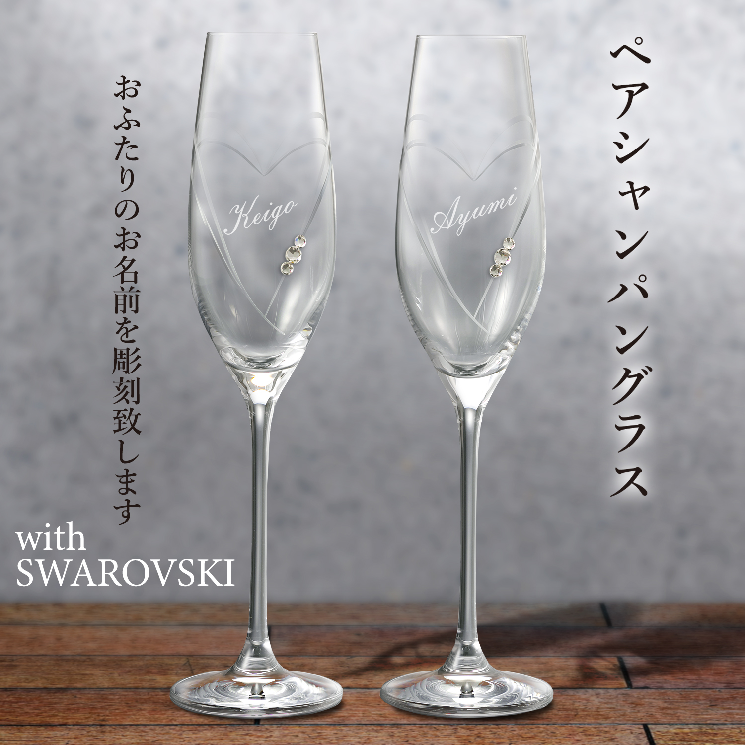 グラスの表面にうっすらと刻まれたハートの上に、3粒のスワロフスキーが輝くクリスタル製シャンパングラスのペアセット。乾杯して響く華やかな音色が2人の食卓を流れます。名前入れができるので相手の名前を入れて結婚祝いや記念日のプレゼントで贈ってみてはいかがでしょうか?