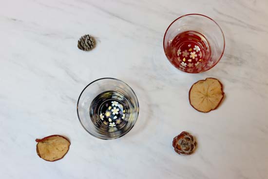 美しい桜の花の絵柄も、角度を変えて眺めてみるとまた違った印象に。グラスに注ぐお飲物を変えても見え方の違いが楽しめそうです。緑茶を入れるとこんなにも暖かい印象になりますよね!