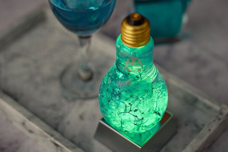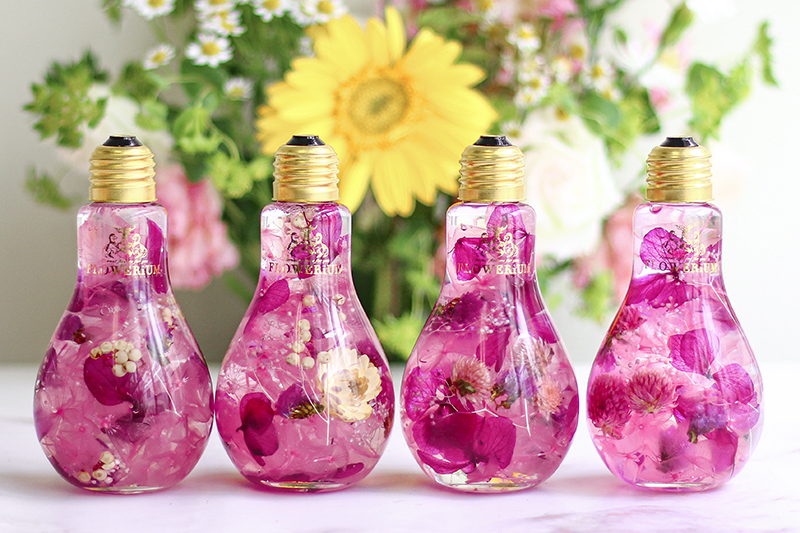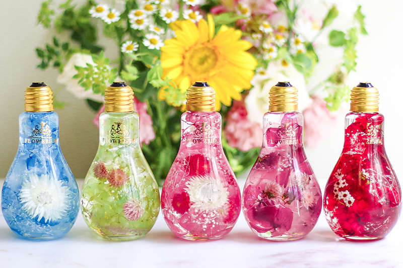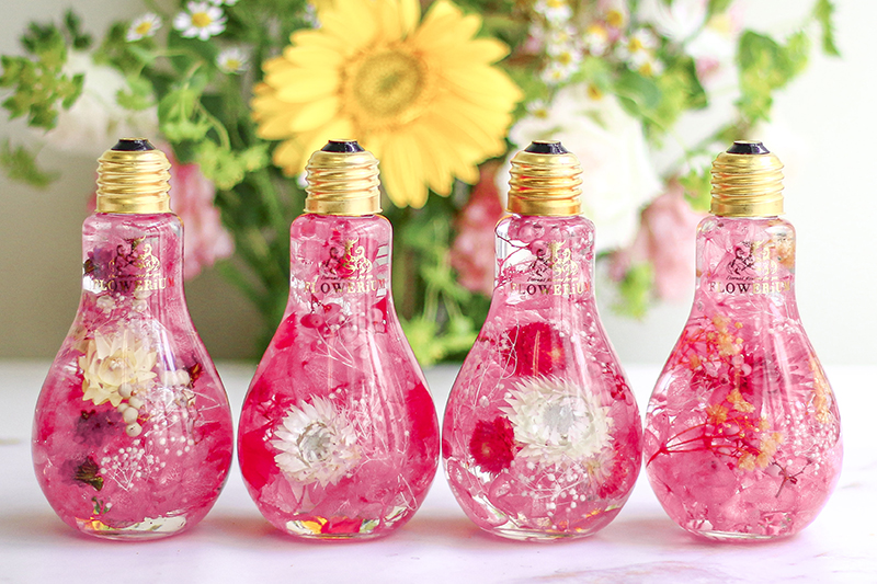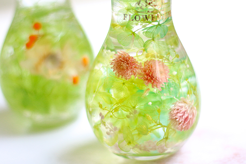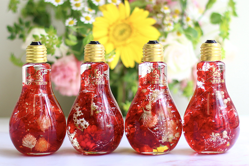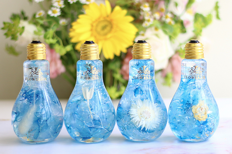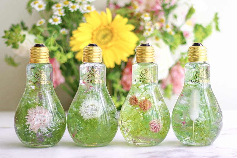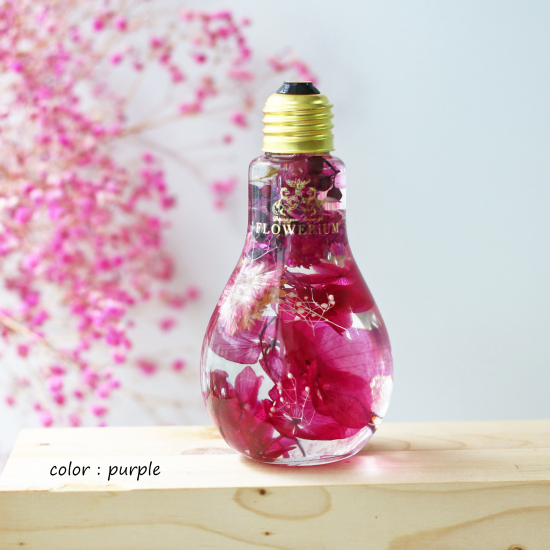 本物の花たちをガラスの中に閉じ込めたフラワリウム。色や形が異なる季節の花々が使われているため、どれも世界にたった一つだけの作品です。ガラスを動かすと、揺れる花びらの美しさを楽しめます。かわいい豆電球のデザインをしたガラスに入っています。