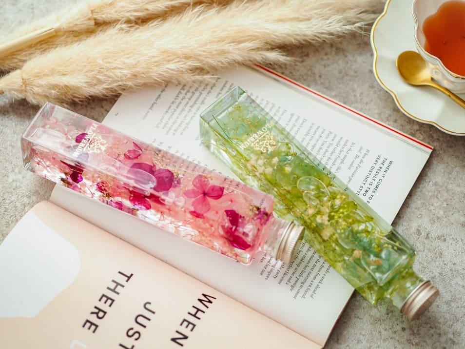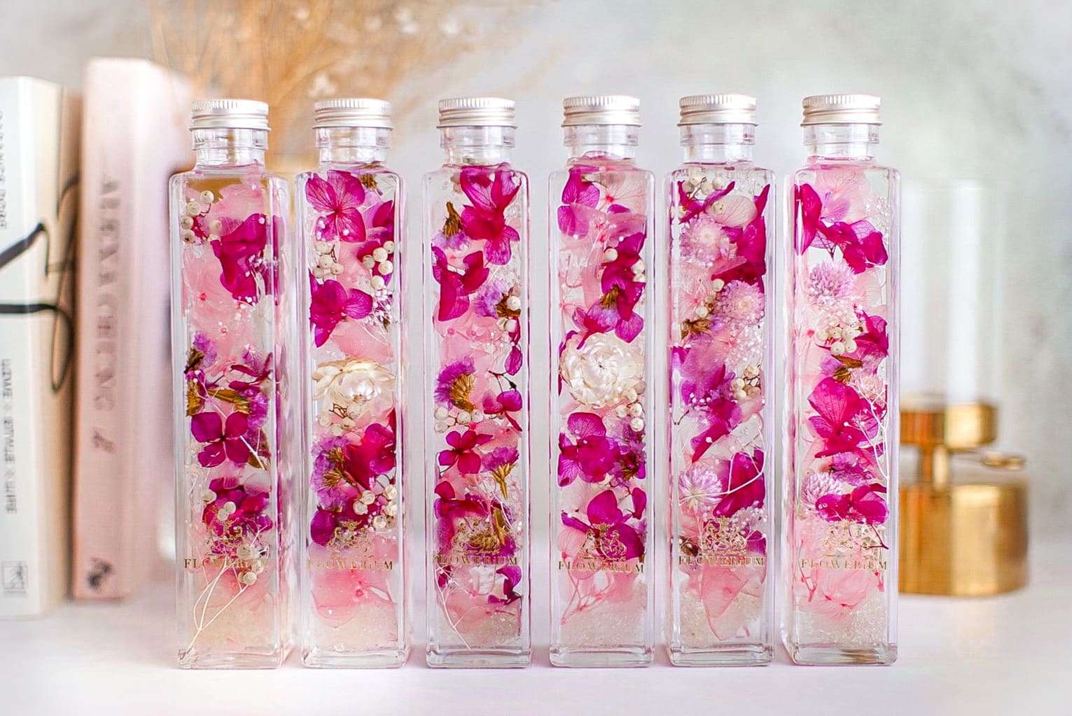 スリムでスマートな形は、飾る場所を選ばず空間を華やかに彩ってくれます。ボトルを上下にひっくり返したり、傾けたりすればガラスの中で花がゆっくりと優しく揺れ動きます。光が通過するたびに葉脈が透き通り、キラキラと美しく輝きます。みずみずしさと鮮やかさを得た、生け花とは違う新しい命を吹き込まれた花々をお楽しみください。
