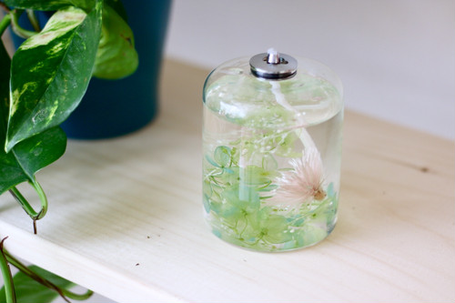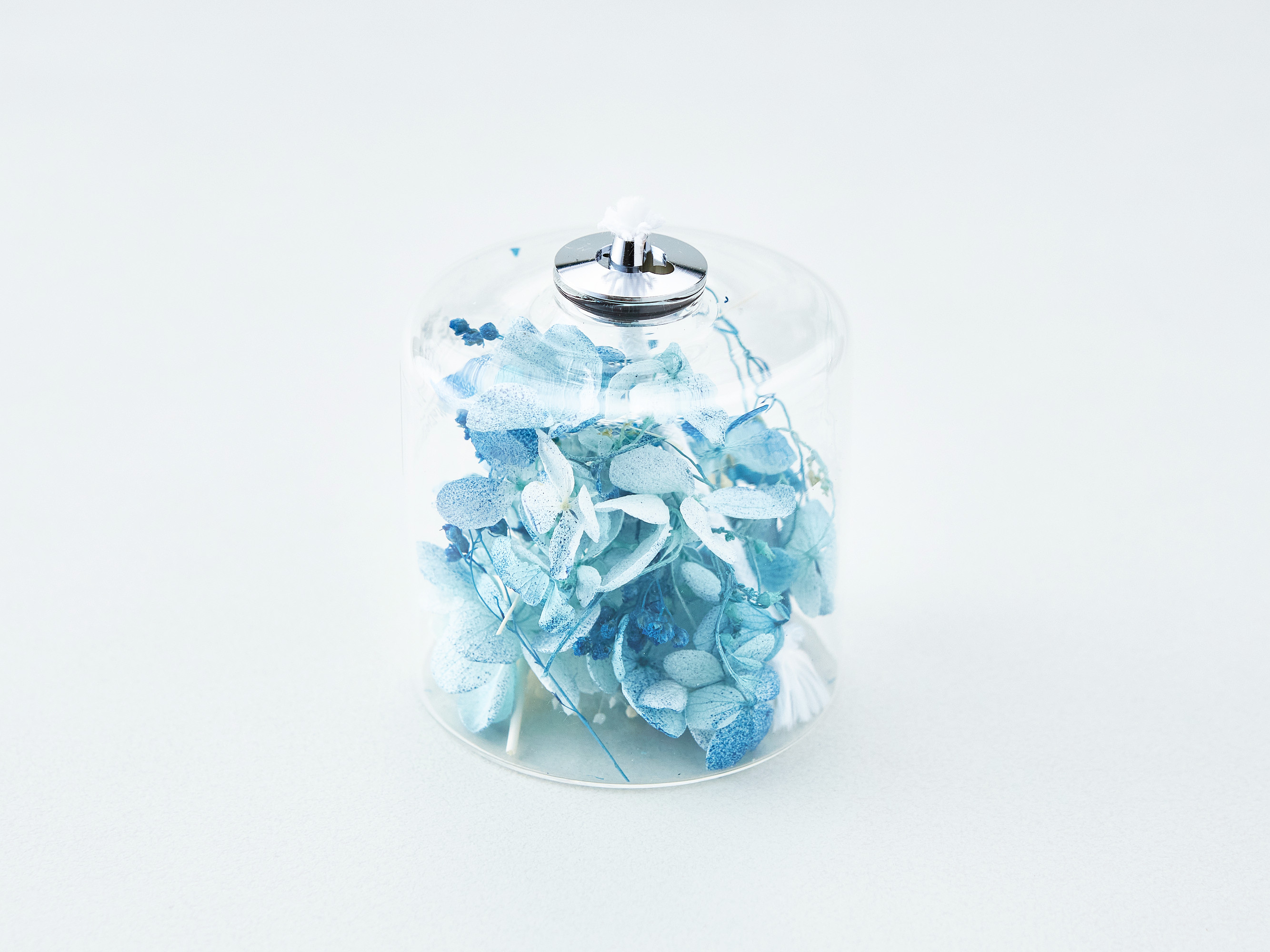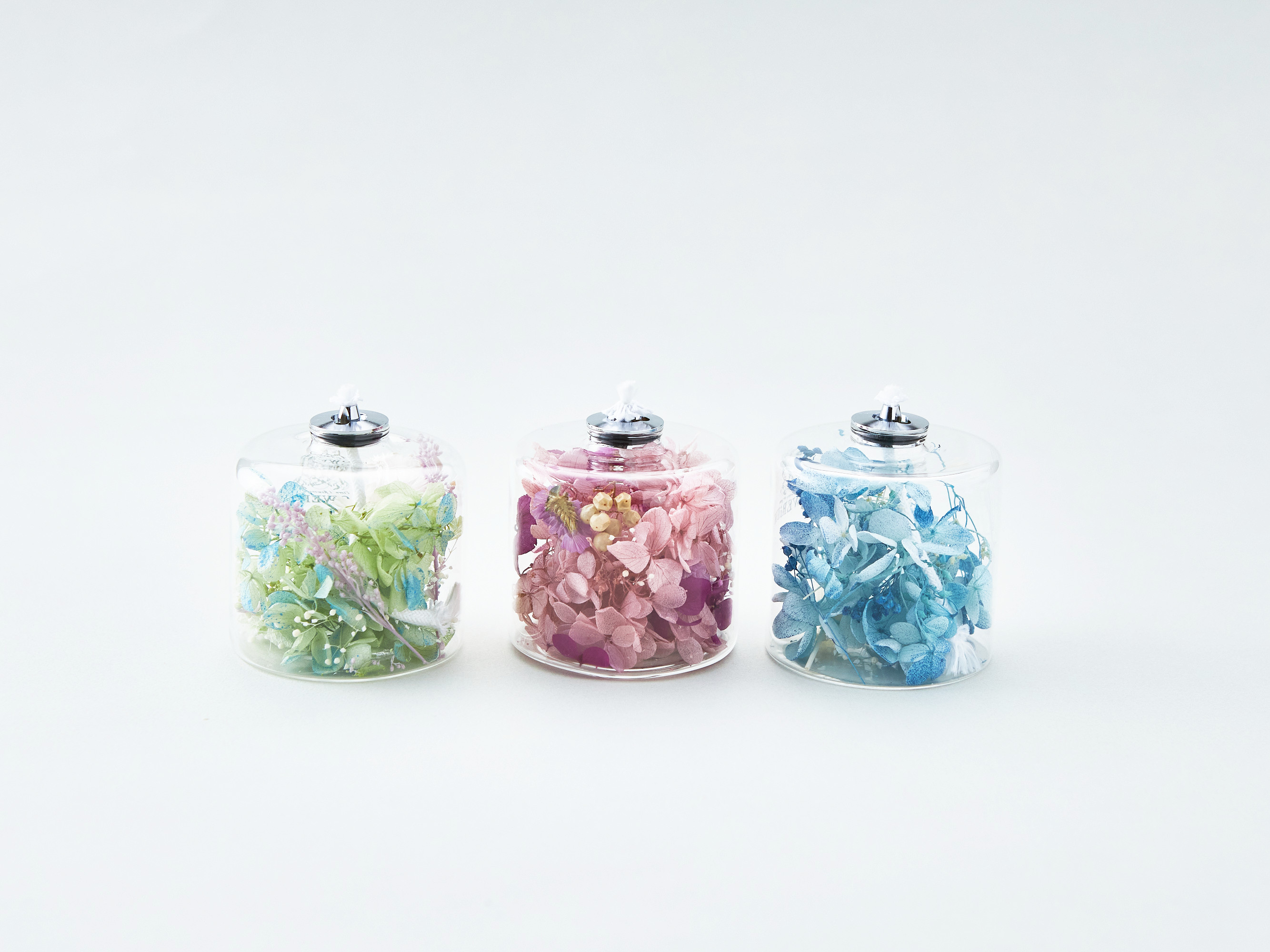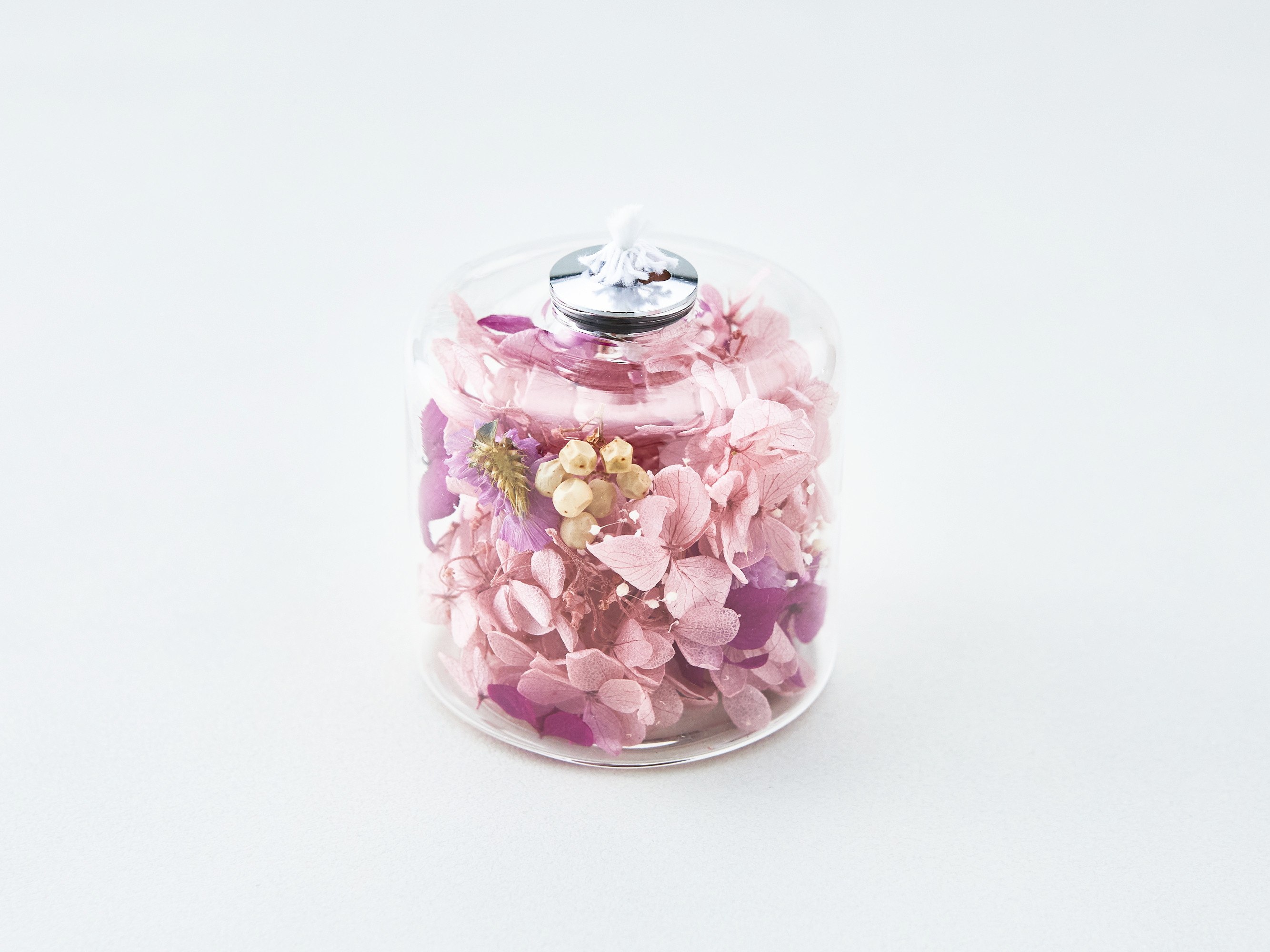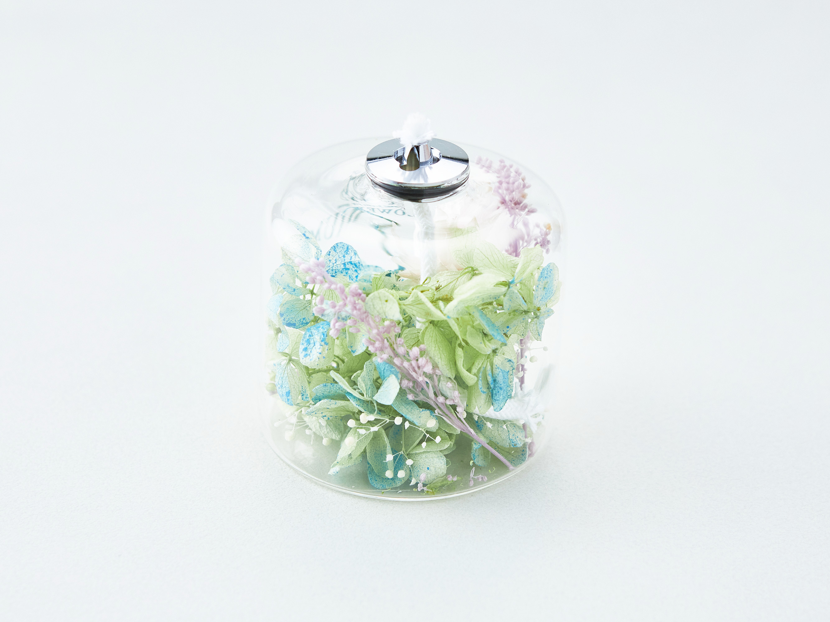 本物の花々をガラスの中に閉じ込めたキャンドルランプです。昼間はみずみずしい花を、夜は灯をともすことで炎に揺れる美しい花々を楽しんでいただけます。キャンドル液は油煙などもでないため安心であり、つぎ足せば繰り返し使用できるので経済的です。