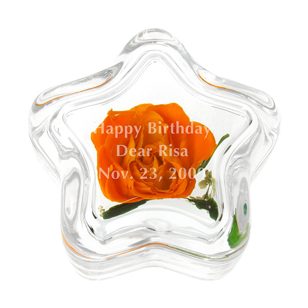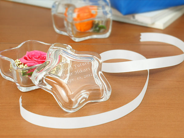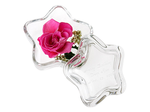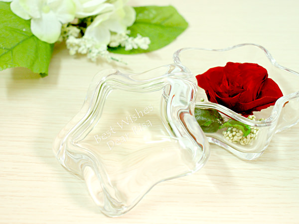 かわいい星の形のガラスケースに入った、プリザーブドフラワーです。ふた付きだからホコリも入らず、お花を美しくみずみずしいまま飾ることができます。光り輝く星の形は、輝いてほしい人への贈り物に最適です。ふたにはメッセージを入れることもできます。