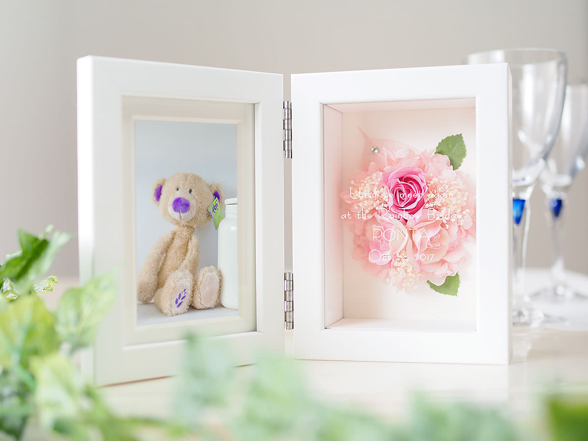 プリザーブドフラワーとアートフラワーのアレンジがとても華やかな、人生の一ページを飾るのに最適なブック型の写真立てです。いつまでも色あせない思い出の写真、枯れることのないお花と消えることのないメッセージを添えて。