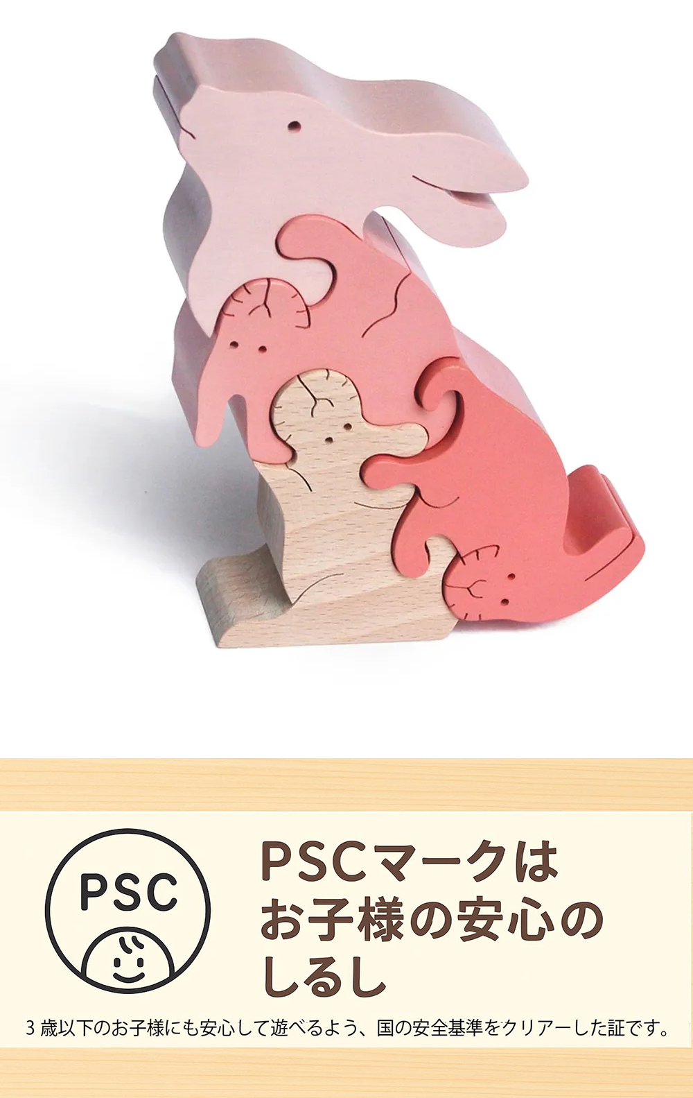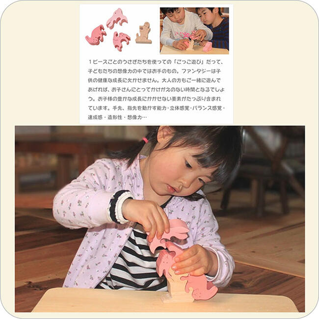 大口注文・法人のお問い合わせはこちらうさぎを組み合わせて出来るのは、大きな可愛いうさぎです! 3匹のうさぎを組み合わせて、お顔を付けたら大きなうさぎに大変身します。可愛いベビーピンクのグラデーションに塗られたパズルのピースは、1つ1つが愛くるしさ抜群! パズルだけではなく「おままごと」や「ごっこ遊び」としても楽しめます。とぼけた表情のうさぎ達に、女の子はもちろん男の子もメロメロ。 ピース数が少ないので、小さなお子さんも遊べますよ。遊び方はお子さんお孫さんの思いつくままに。好奇心旺盛な子供の五感に働きかける、銀河工房おすすめの赤ちゃん・幼児用おもちゃです。