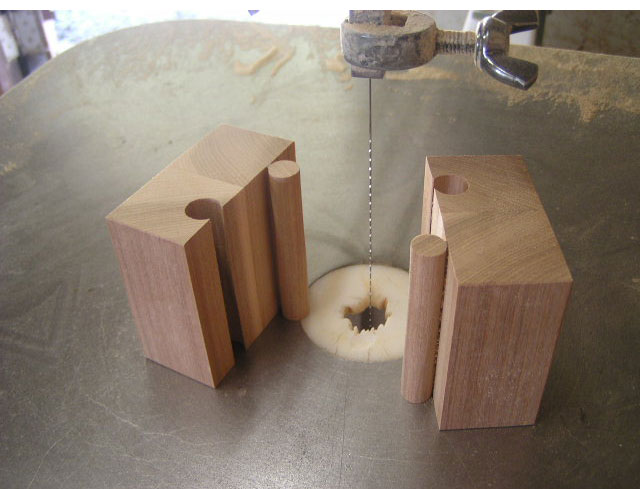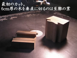 立方体に最初のカットを入れたところ。厚さ6cmの木を垂直に切るのは非常に難しいのです。斜めになってしまったらもうパズルとしては利用できません。パズルを作るために、熟練した技術が必要です。