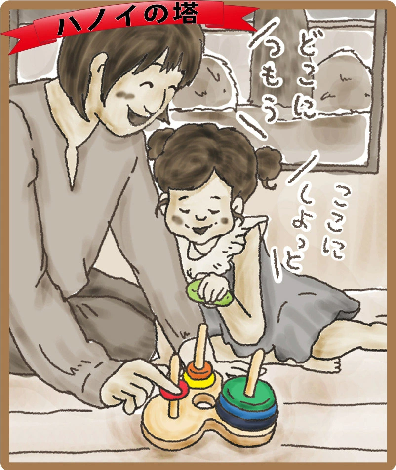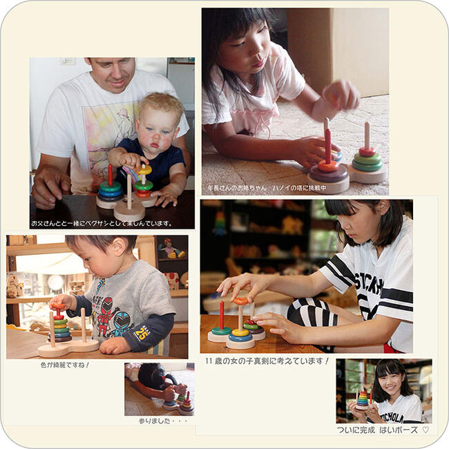 大口注文・法人のお問い合わせはこちら赤ちゃんも高齢者も楽しめる万能玩具・ハノイの塔! 「ハノイの塔」は、フランスの数学者E・リュカ(Edouaed・Lucas)が1883年に考案した、考える力を養える画期的なおもちゃです。 遊び方も年齢によって様々に活用出来るのも、この玩具の魅力。赤ちゃんなら円盤1つ2つを使ってカチカチと音を立てて遊んだり、学生さんなら数学の教材として活用したり。高齢者の認知症予防にも役立ちます。 年代を選ばず誰でも遊べるおもちゃですので、これ1つあればご家族でいつまでも末長く楽しむ事が出来ますよ!銀河工房のおもちゃは、安全な植物性の塗料を使用しています。赤ちゃんがうっかり舐めてしまっても安心です。