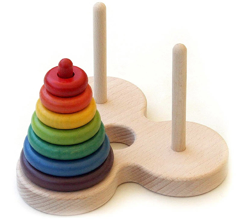 数学パズルハノイの塔(本体、7色の輪)のセットをお届けします。