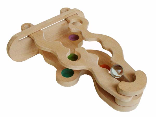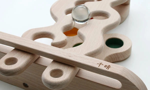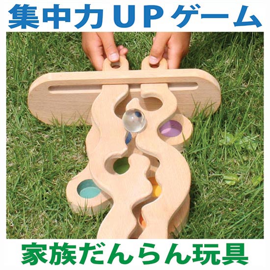 2本のハンドルを動かして遊ぶこのおもちゃは、集中力が必要になるので「集中力アップゲーム」と名付けられました。 なるべく手前の穴に玉を入れられるように、ハンドルを上手く広げたり閉じたりするのがポイント。細かくゆするように動かすと、上手くゴールまで玉を運べます。 年代問わずハマってしまうようで、銀河工房のギャラリーに遊びにきてくださった大人の方々も、子供に戻ったように遊んでいました。 「もう1回」「いや、もう1回」と家族みんなで夢中になって楽しめるおもちゃです。
