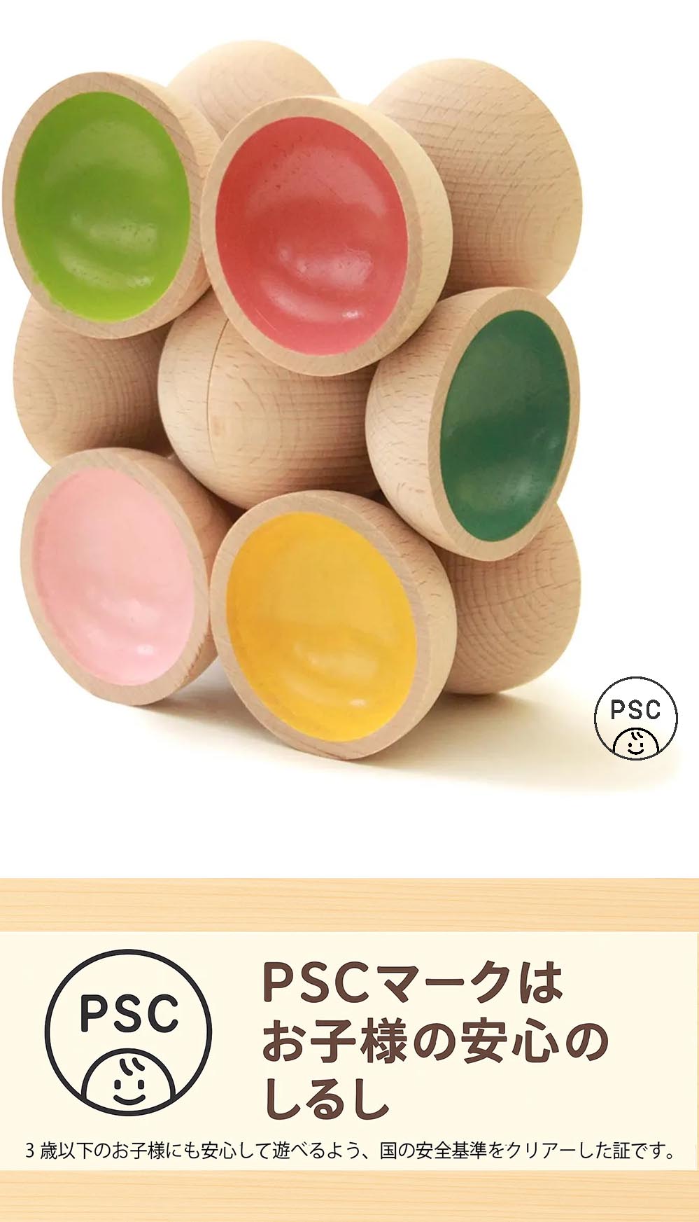 ●カップ積み木は、銀河工房の女性職人が一つ一つ丁寧に作っています。ヨーロッパ産のブナを使用し、表面は安全な植物性塗料を使用、お子様がなめてしまっても大丈夫です。 ●柔らかく面取りしており、角ばった部分はありませんので、小さなお子様も安心して遊べる安心度の高いおもちゃです。 ●このおもちゃには名入れ(有料)も可能です。お子様の名前をレーザー刻印することができます。