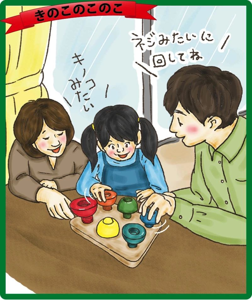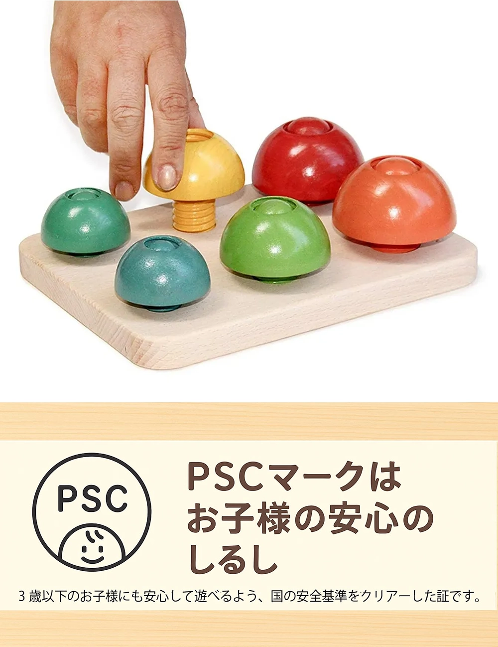 大口注文・法人のお問い合わせはこちらボードに付いたネジにはめて、かわいい「きのこ」作っちゃお!大きさの異なる6種類の半球のピースをボードに付いたネジにはめこんで、かわいい「きのこ」を作るパズルおもちゃです。 カラフルな6種類のネジとピースの色が目にも楽しいです!ネジの大きさと色の違いを認識する事で、子供さんの知力を養います。同時に、このパズルはピースをはめ込む為に「ねじる」という手首の運動が必要になります。 これから成長するにつれて生活の様々な場面で必要になる「物をねじる能力」を大きく養える、画期的な知育玩具です。 きのこの傘は、上下逆さまにしてもすっぽりとハマります。子供さんの気分のままに、色々な長さのきのこを作ってくださいね。上下逆にした傘をネジにはめ込むと、かわいいコーヒーカップやお花にも見えちゃいます。 優しい木のぬくもりに触れながら、想像力や美的感覚など様々な力も養う事が出来ますよ!