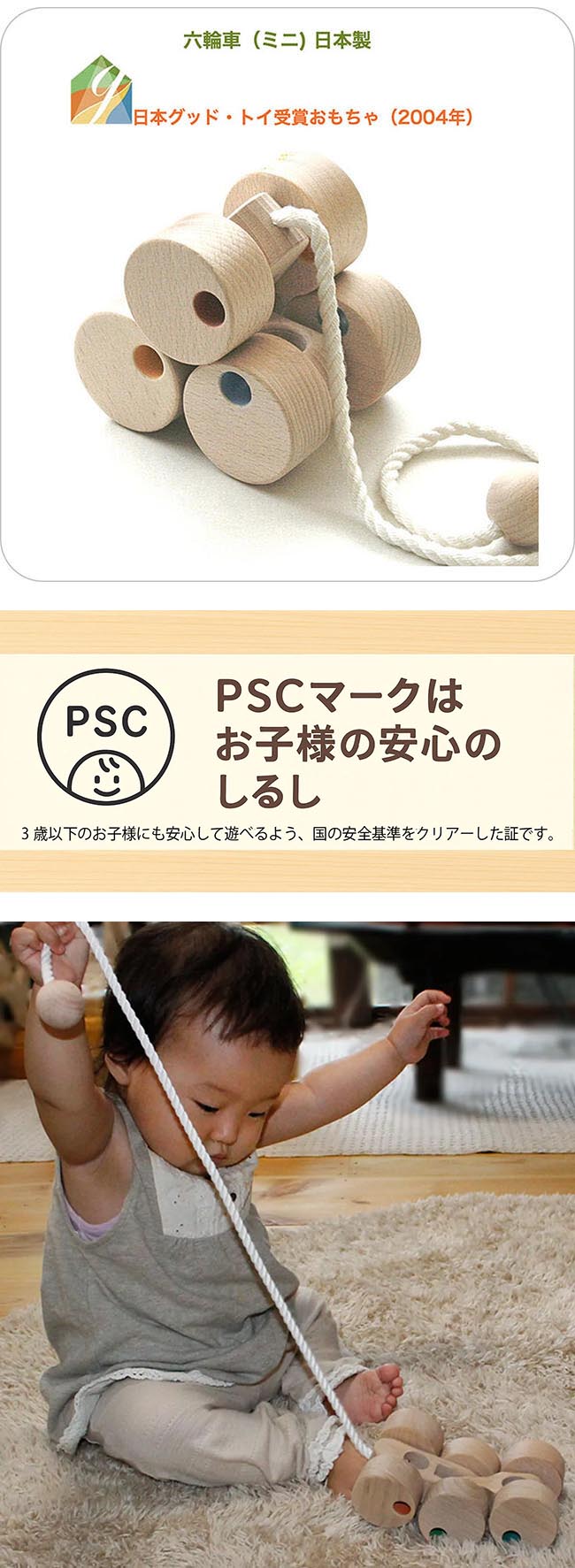 「木のおもちゃ製作所 銀河工房」が作り上げた”六輪車(ミニ)”おもちゃです。優しい木の温もりを感じられる、はじめてのおもちゃにピッタリです。赤ちゃんが舐めても安全な自然素材の塗料を使用しておりますので、歯がためとしてもお使いいただけます。