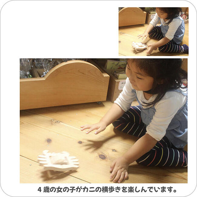 輪ゴムのパワーでスイスイ泳ぎます!このカニさんは、なんと!お風呂で遊ぶ事が出来ます! 中央にある水かきをクルクル回して水面に置くと、輪ゴムの力で水かきが回転しユーモラスに泳ぎ出します。お部屋の中でもクルクル回して床に置くと横向きに歩き出しますよ。お子さんお孫さんとのお風呂遊びのお供に、是非とも使ってくださいね。 ※当商品は輪ゴムを使って遊びます。輪ゴムの数やかけ方はそれぞれ工夫しましょう。お部屋で遊ぶ時は輪ゴムを2本に、お風呂では1本にするとスムーズに動き出します。お風呂で遊ばせたら日陰に干してお手入れしてください。輪ゴムは使う度に新しいものに交換してください。