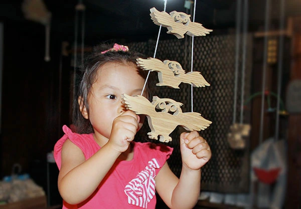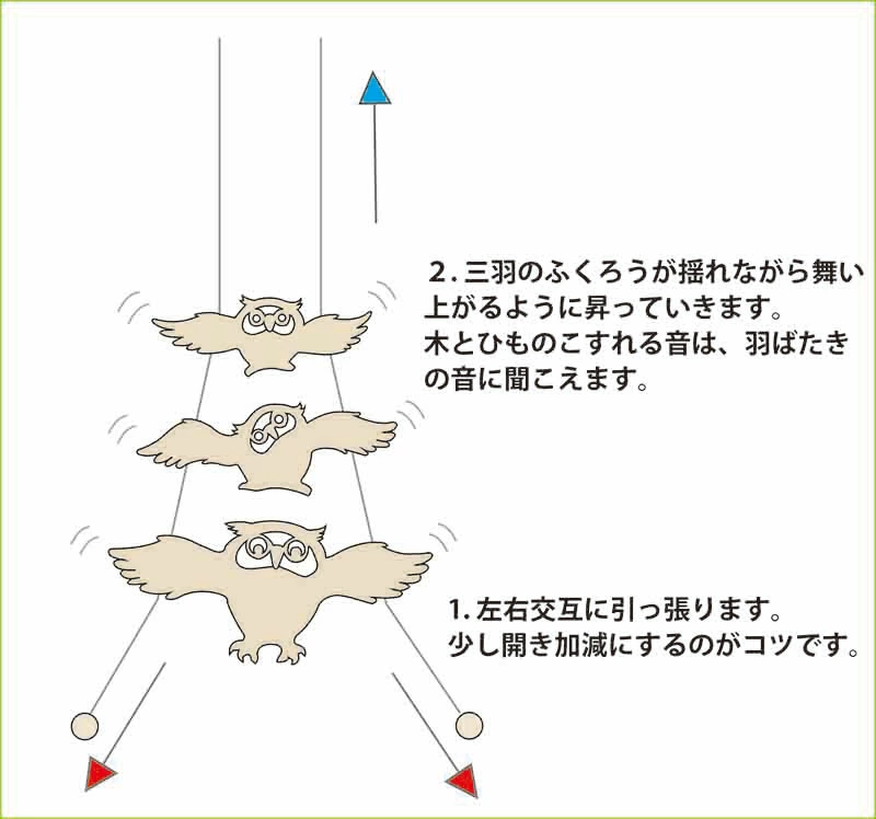 1. 左右交互に引っ張ります。少し開き、加減するのがコツです。 2.三羽のふくろうが揺れながら舞い上がるように昇って行きます。木とひものこすれる音は、羽ばたきの音にも聞こえてきます。