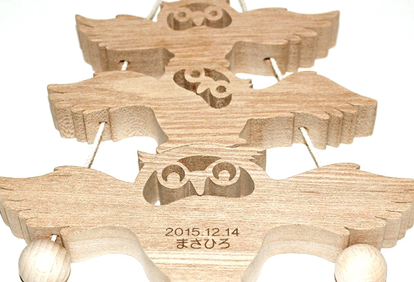 ふくろうの昇り人形にはメッセージや名入れ(有料)も可能です。お子様の名前をレーザー刻印することができます。 出産祝いやお子様の誕生日プレゼントにもぴったりです。