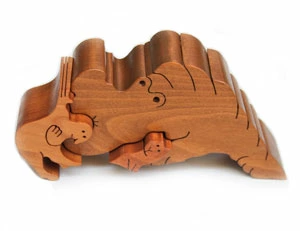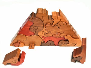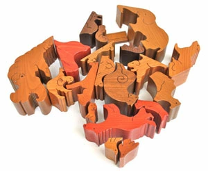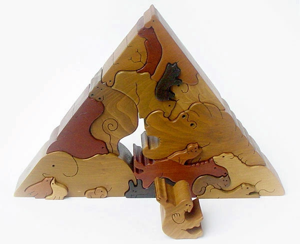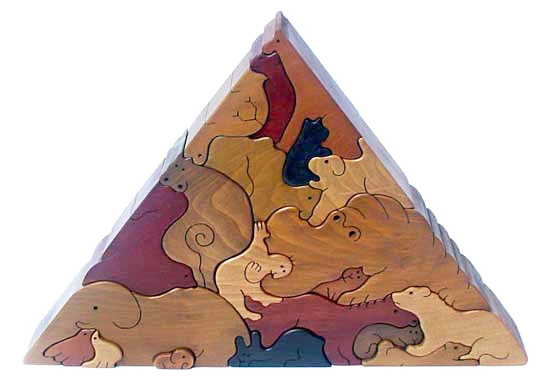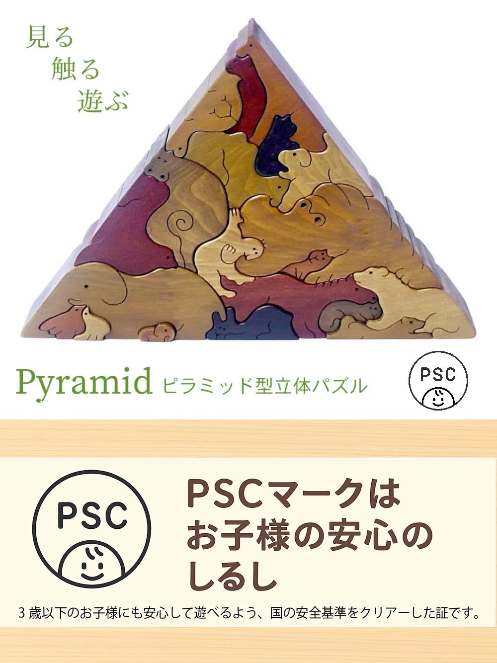 大口注文・法人のお問い合わせはこちらこのおもちゃは1才から楽しめますが、上級者向けのパズルです。大人でも難しいと感じてしまうかもしれません。ですが、それがこのパズルの醍醐味ともいえます。 寝転がったカバ、ゾウ、ラクダといった動物達のピースで、ピラミッドを組み上げていく立体パズルです。このパズルには裏表があるので、組み上げる時に裏と表を認識する力が必要になります。ピッタリと収まる形を素早く見つけるには、右脳をフル回転させる必要があります。 小さな子供さんが遊ぶ際には、始めは動物のピース1つ2つで「ごっこ」遊びをするのが良いかも知れません。 2個だけ3個だけの簡単なパズルから始めて、慣れてきたら全てのピースでピラミッドパズルに挑戦してみましょう。 五感と共に造形感覚・創造性を大きく養える、銀河工房自信作の知育パズルです。