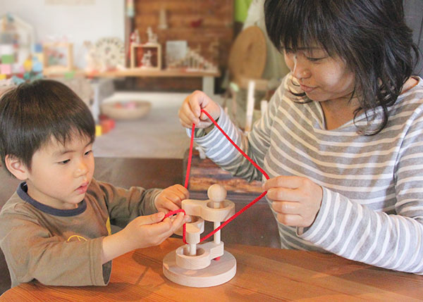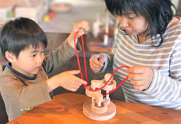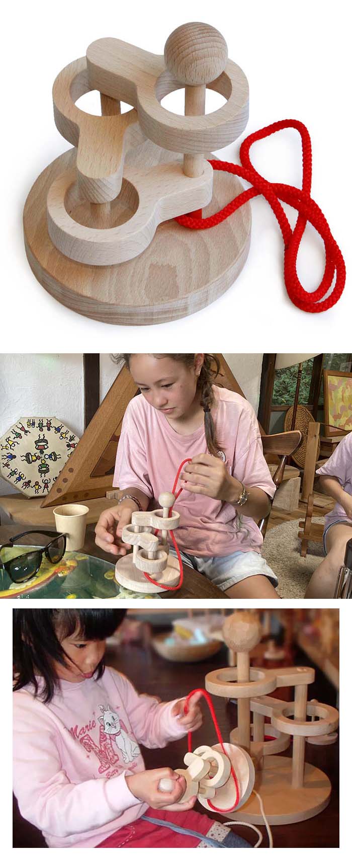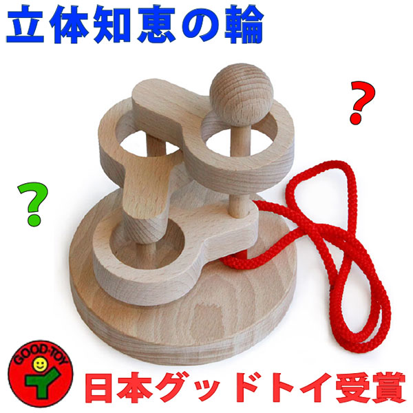 大口注文・法人のお問い合わせはこちら木のリングを組み合わせて作られた立体型の「知恵の輪」です。一番下の段に巻かれた赤い紐を抜き取って遊びます。こちらの3段型の知恵の輪は、5才から挑める難易度となっております。 空間認識力、論理的思考、推理力…。 子供さんの成長に役立つ様々な能力を養う事が出来ます。 お子さんお孫さんへのプレゼントにはもちろん、大人のリフレッシュ遊びや高齢者の認知症予防など、多彩な用途にご利用していただけます。 ご家族の皆さんで挑戦してみてはいかがでしょうか?