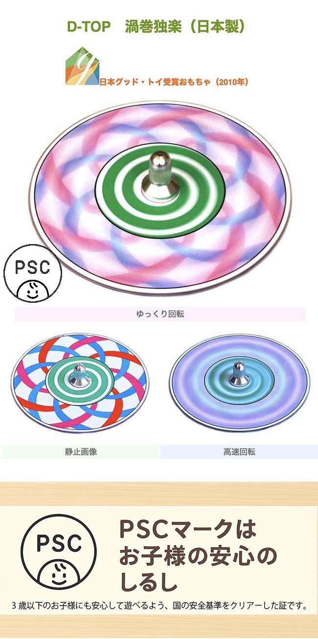 大口注文・法人のお問い合わせはこちら「D-TOP 渦巻独楽」は中心に緑の渦巻き模様、外側は3色の線で渦巻きが表現されている、CDで作られた独楽(コマ)です。 こちらの独楽(コマ)はデザインにこだわっており、回してみると不思議な現象が…! 赤と青の模様が溶け合って紫に変わったり、白黒の模様が回すと虹色に見えたり。回転の速さや周りの環境でも見え方が変わってきます。 是非、顔を近付けて瞬きをしながら独楽を見てみてください。 混ざり合った色が目の動きで分解されて、また不思議な模様が浮かんできます。絵が立体的に浮かび上がる独楽もあります。 安定感も抜群で、長い時間楽しめます。 お部屋の中で回してみてください。蛍光灯の光に反応して、模様が止まって見えたり、逆方向に回っているかのようにも見えますよ。 トリッキーで楽しいこの独楽で、家族の楽しい時間を満喫してみてくださいね。
