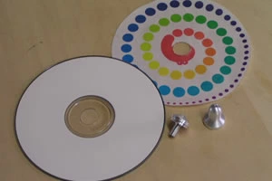独楽の軸になっているアルミ製の軸は、現在特許出願中です。とても簡単な構造で、ねじを回すようにCDにはめることが出来ます。銀河工房のCD独楽は、無地のCDにデザインや色に工夫を凝らした絵を貼り付けて出来ています。 簡単にCDから軸をはずせますので、銀河工房製デザインの他にオリジナルデザインのCD独楽を作ってみてはいかがでしょうか?