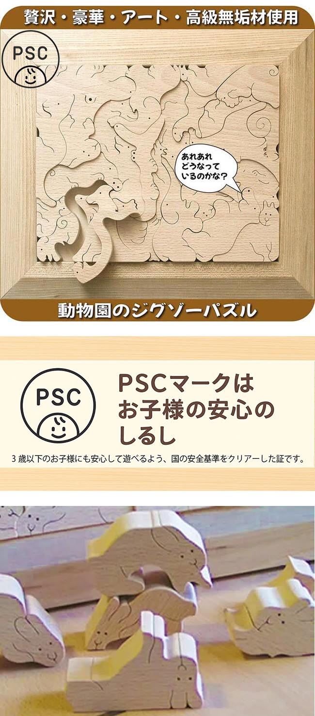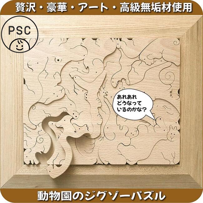 通常のジグソーパズルとは異なり、各ピースは30mm前後の厚みがあります。 そのため、立たせたり寝かせたり、積み上げたりと積み木のような遊び方も出来ます。 また、表情豊かで個性的な動物たちは、もっと自由な遊び方を引き出してくれるでしょう。