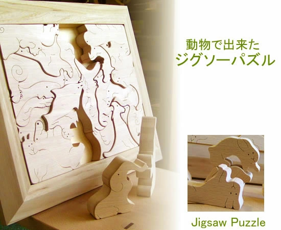 ピースの1つ1つが様々な動物の形をしています。木枠の内側にジグソーパズルとしてはめ込んで遊べる他に、30mmの厚さがある立体的なピースを積み木のように組み上げてバランスゲームをしても楽しめます。お子さんお孫さんの気の向くままに、無限大の遊び方が出来ます。