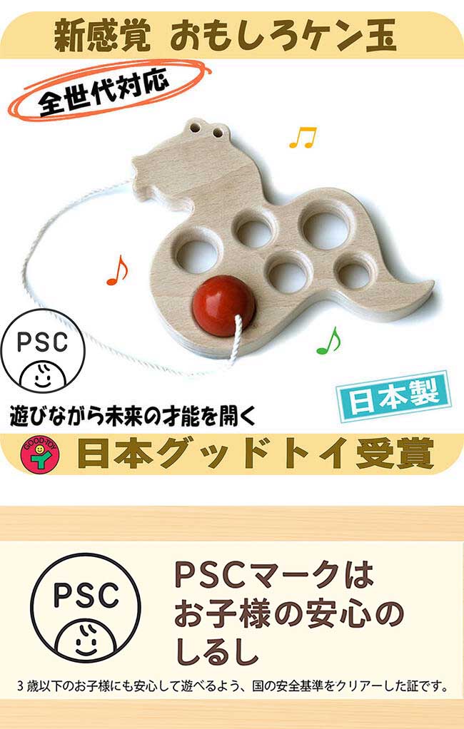 大口注文・法人のお問い合わせはこちらこちらのケン玉は、大小6つの穴が空いたユニークなヘビの形をしているのが特徴です。 穴から穴へ赤い木の球を移動させていくのは、簡単そうで難しい。上手く攻略するには、正しい姿勢と集中力が必要になります。膝の屈伸運動も必要になりますので、小さな子供さんはもちろん、運動不足の大人にもおすすめのおもちゃです。 リフレッシュにもうってつけ。高齢者の認知症予防にもピッタリです。年代を選ばず誰でも遊べるおもちゃですので、子供さんへのプレゼントに、一家団欒・パーティに、リハビリにと様々な用途にご使用いただけます。