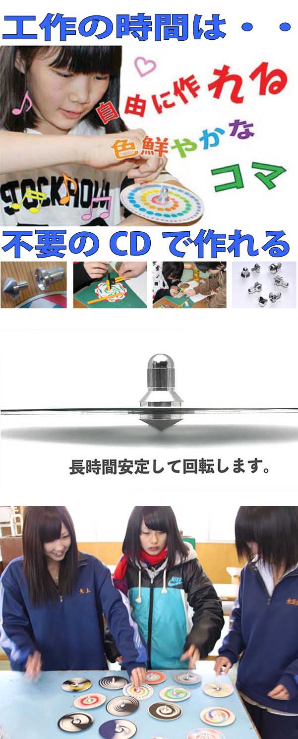 木のおもちゃ製作所 銀河工房が手掛ける、大人気商品「CD独楽」を自分で組み立てて作れる制作キットです。不要なCDディスクがあれば、誰でも魅力的な独楽(コマ)を作る事が出来ます。中心の穴に付属のアルミの軸を付ければ完成です。 学校の教材としてもおすすめです。