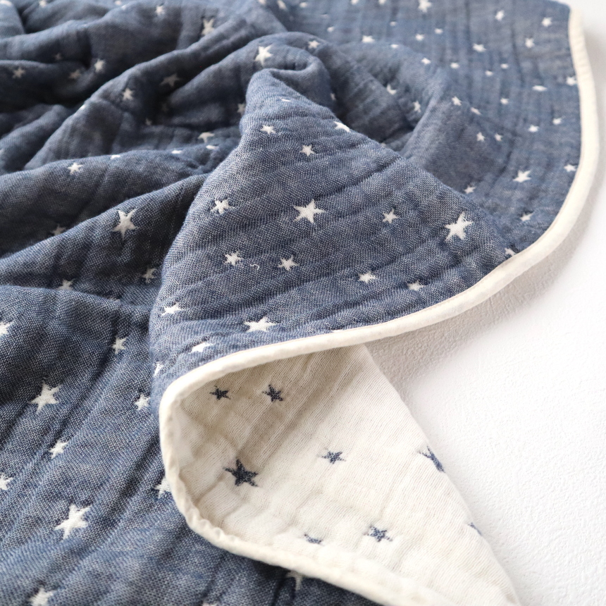 天然素材であるコットンを100%使用した質の高いガーゼ生地は、軽くて、柔らかな肌触りが特徴です。 吸水性だけでなく、保温性・吸湿性にも優れており、その使い勝手の良さが人気の素材です。 粗さの異なるガーゼを6層に織り合わせることで通気性がよくなり軽く、柔らかい風合いのガーゼケットとなりました。 6層構造のガーゼの間に空気を留めることで、保温効果にも優れております。 軽くて暖かく、オールシーズン快適に使用できるガーゼケットです。