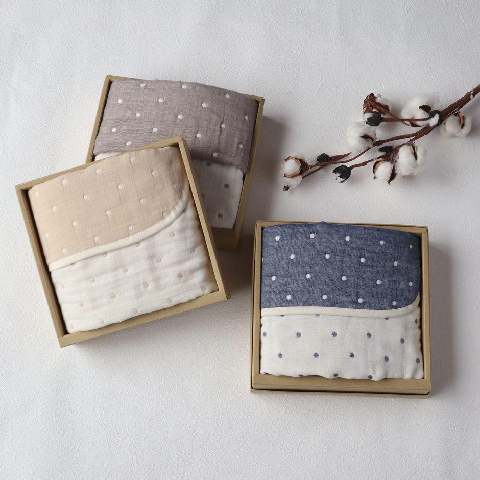 大口注文・法人のお問い合わせはこちら6層構造のガーゼがふんわりと柔らかくデリケートなお肌を優しく包み込みます。 6層のガーゼを織り合わせたガーゼ生地は、吸水性、吸湿性に優れているためさらっとしており気持ちがいいです。 さらに、多重構造に織り上げることで空気が留まりやすく、ふんわりとした風合いになり、保温性に優れていることも特徴です。 ガーゼの間にできる空気の層が外気の温度を調節し、夏は涼しく冬は温かい1年中快適にお過ごし頂けるアイテムです。 膝掛けサイズで、オフィスやリビングでの体温調節としても重宝します。ベビーやキッズのお昼寝ケットやバギーケット、おくるみとしても最適です。 1枚1枚は薄く軽いガーゼが6重に織り合わせることによりとても軽く、綿本来の柔らかさを最大限に引き出しております。 ふかふか生地が気持ちがいいので、大人はもちろんのことお子様にも安心してご使用いただけます。