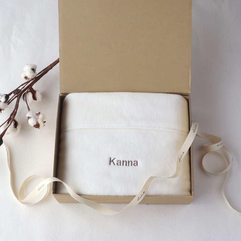 大口注文・法人のお問い合わせはこちら天然素材であるコットンを100%使用した綿毛布です。 ふっくらと柔らかく、吸湿性・保温性に優れております。 また静電気が起こりにくく、ご家庭で洗濯のできるので、お子様にも安心してご使用いただけます。 ホワイトの綿毛布にお好みのカラーと字体で名入れ刺繍がはいる、特別感のある大変人気なギフトです。 シンプルなデザインはどんなインテリアにも馴染み、ナチュラル志向のママさんにも喜んでいただけます。 名入れ刺繍は、1文字の幅が約2~3cmです。(字体・文字数により多少文字サイズは前後いたします。名入れには別途料金がかかります。)