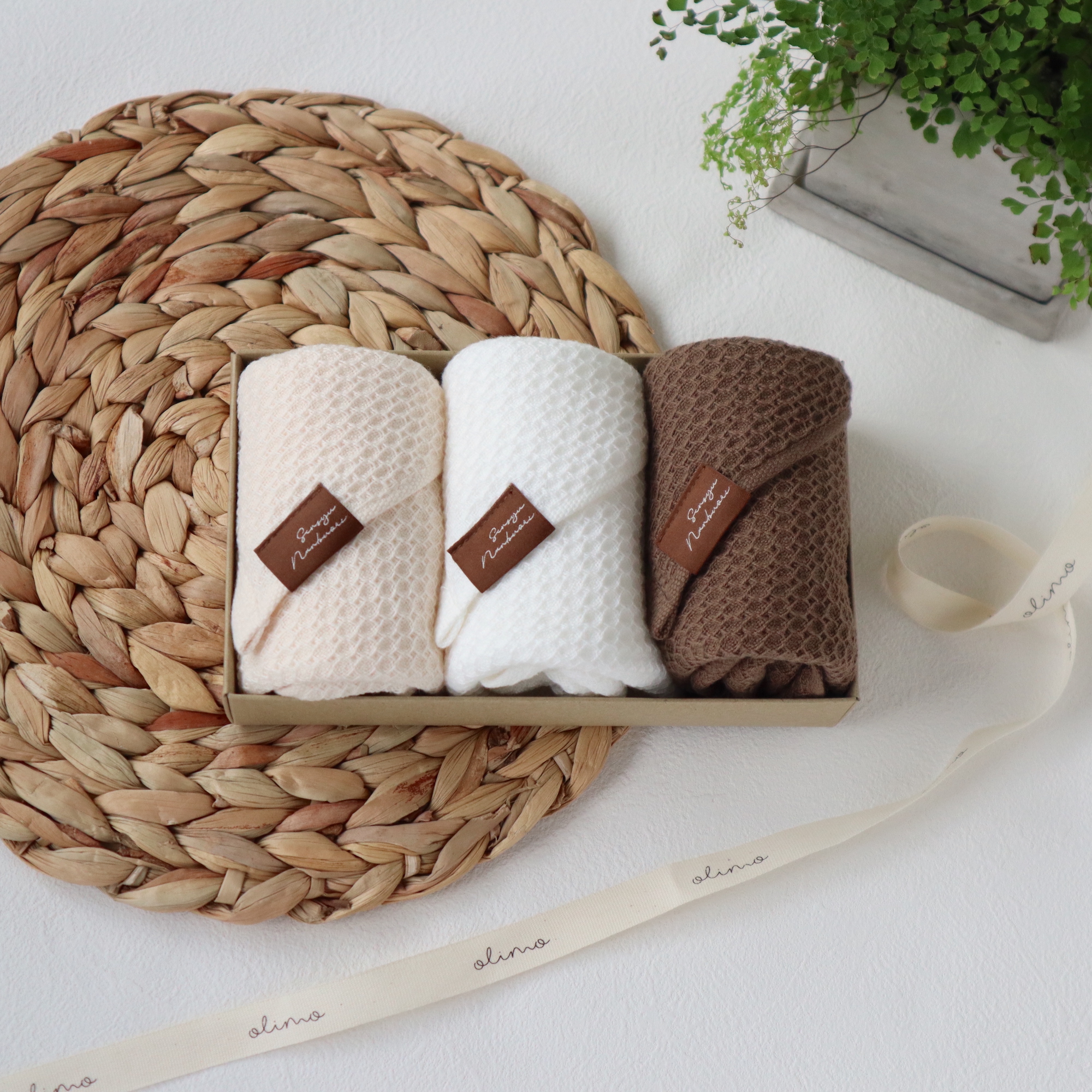 人気のホワイト・ベージュ・ブラウンの3色がセットになったアソートです。 ギフトでは好みが分かれないナチュラルなカラーが最適! 用途でカラーを分けてのご使用にも便利。