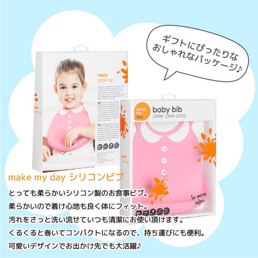 大口注文・法人のお問い合わせはこちら【make my day (メイクマイデイ)】のビブはとても柔らかくて丈夫なシリコン100%のビブです。スタイリッシュで機能的なデザインで6ヵ月~3歳までのお子さまにご使用いただけます。 ジュエリーやお洋服のようなデザインは「ほめられビブ」として、おしゃれママに人気です。かわいいデザインでお出かけ先でも大活躍します。 プレゼントにもおすすめです。