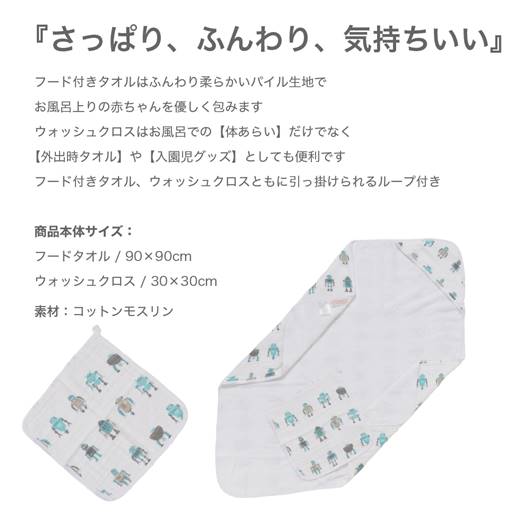 大口注文・法人のお問い合わせはこちらフード付きタオルはふんわり柔らかいパイル生地でお風呂上りの赤ちゃんを優しく包みます。 ウォッシュクロスはお風呂での【体あらい】だけでなく【外出時タオル】や【入園児グッズ】としても便利です。フード付きタオル、ウォッシュクロスともに引っ掛けられるループ付きです。