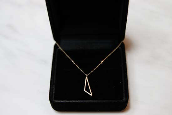 トライアングルモチーフをトップに配したクールな印象のネックレス。さりげなくも、遊び心溢れるスタイルを演出してくれるジュエリーです。幅広いコーデとハマってくれるシンプルなデザインと程良い大きさで軽い着け心地なので気軽に普段使い出来るアイテム◎