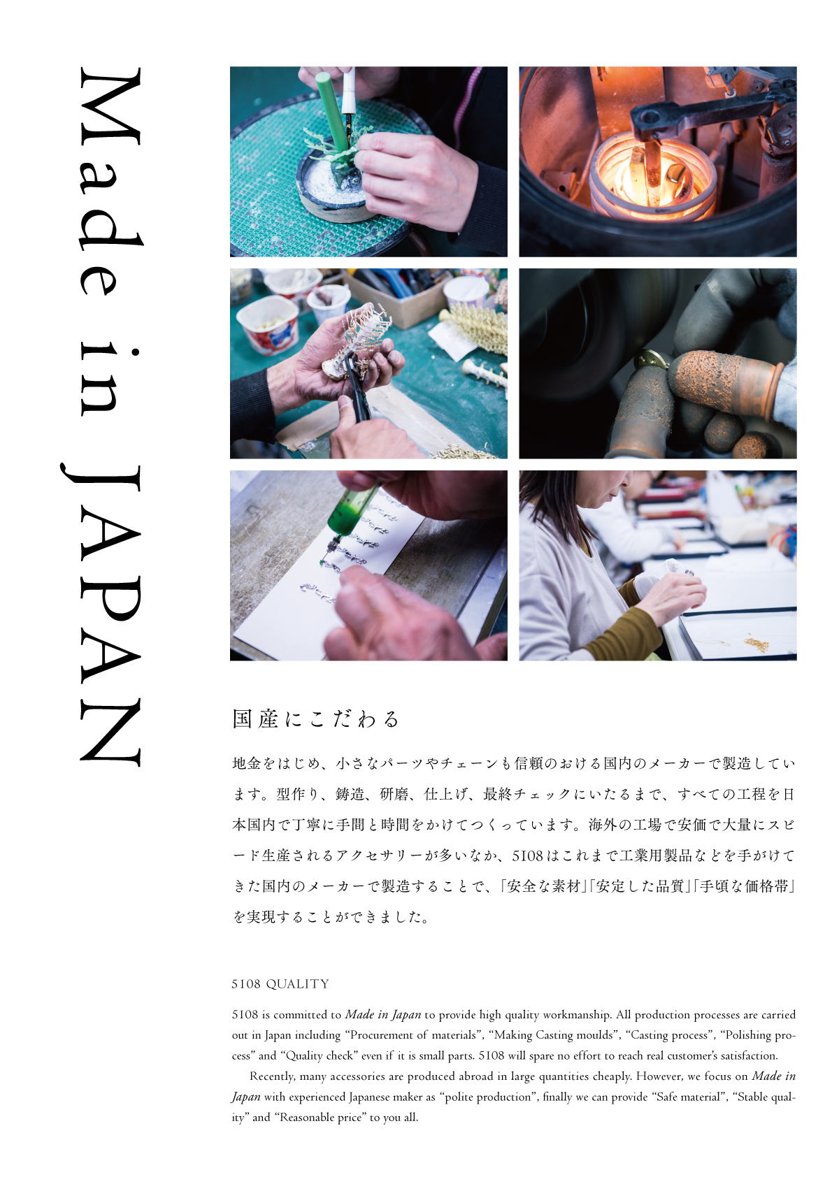 地金をはじめ、小さなパーツやチェーンも信頼のおける国内のメーカーで製造しています。型作り、鋳造、研磨、仕上げ、最終チェックにいたるまで、すべての工程を日本国内で丁寧に手間と時間をかけてつくっています。 海外の工場で安価で大量にスピード生産されるアクセサリーが多いなか、【5108】はこれまで工業用製品などを手がけてきた国内のメーカーで製造することで、「安全な素材」「安定した品質」「手頃な価格帯」を実現することができました。