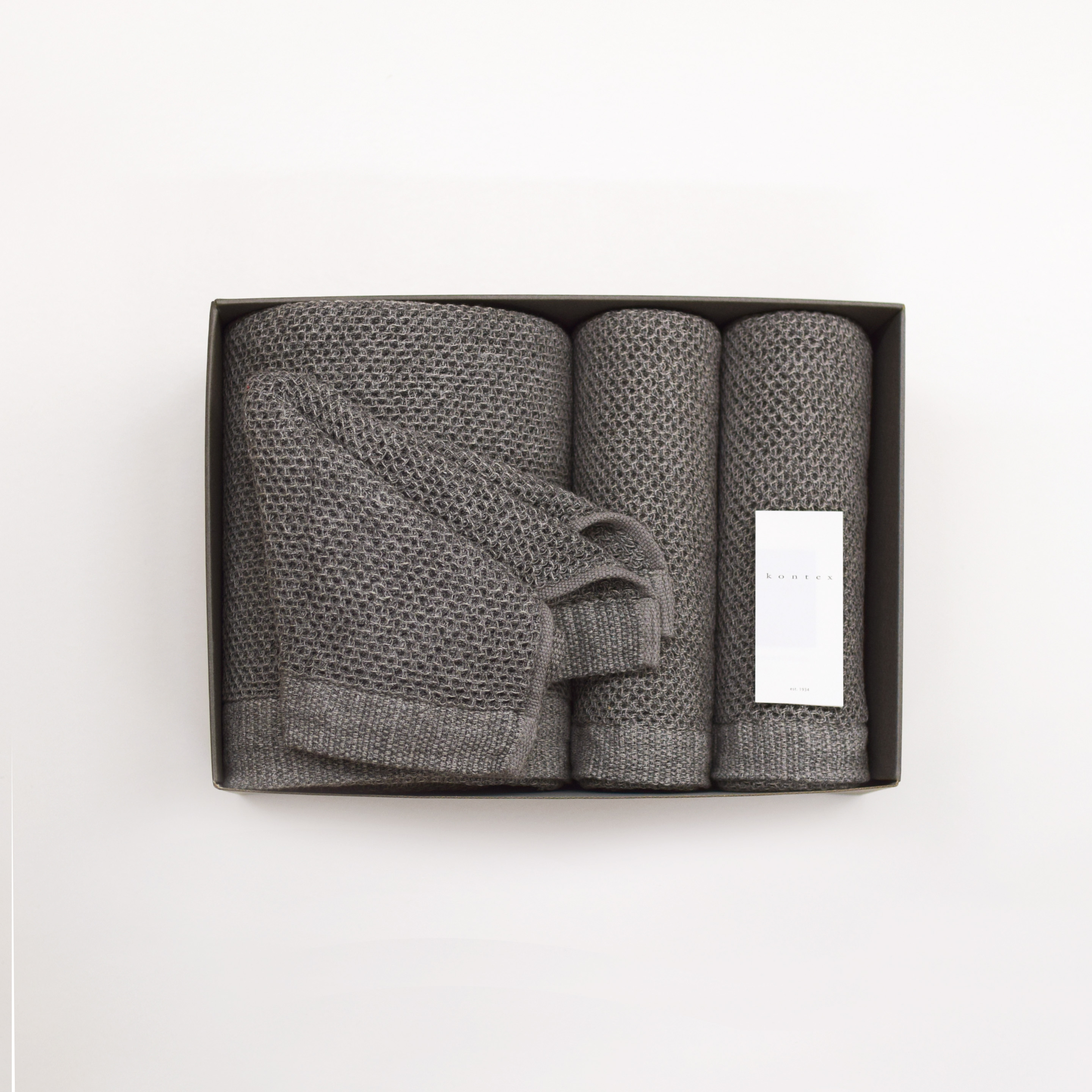 インテリアにも馴染むおしゃれなワッフルタオルはご自宅用にはもちろん、贈り物としても最適です。 シックで落ち着きのあるカラーにロゴの入った高級感漂うパッケージも魅力です。 【kontex(コンテックス)】の”ヴィンテージワッフル XL×1M×2S×1セット”をお祝いの贈り物としていかがでしょうか。