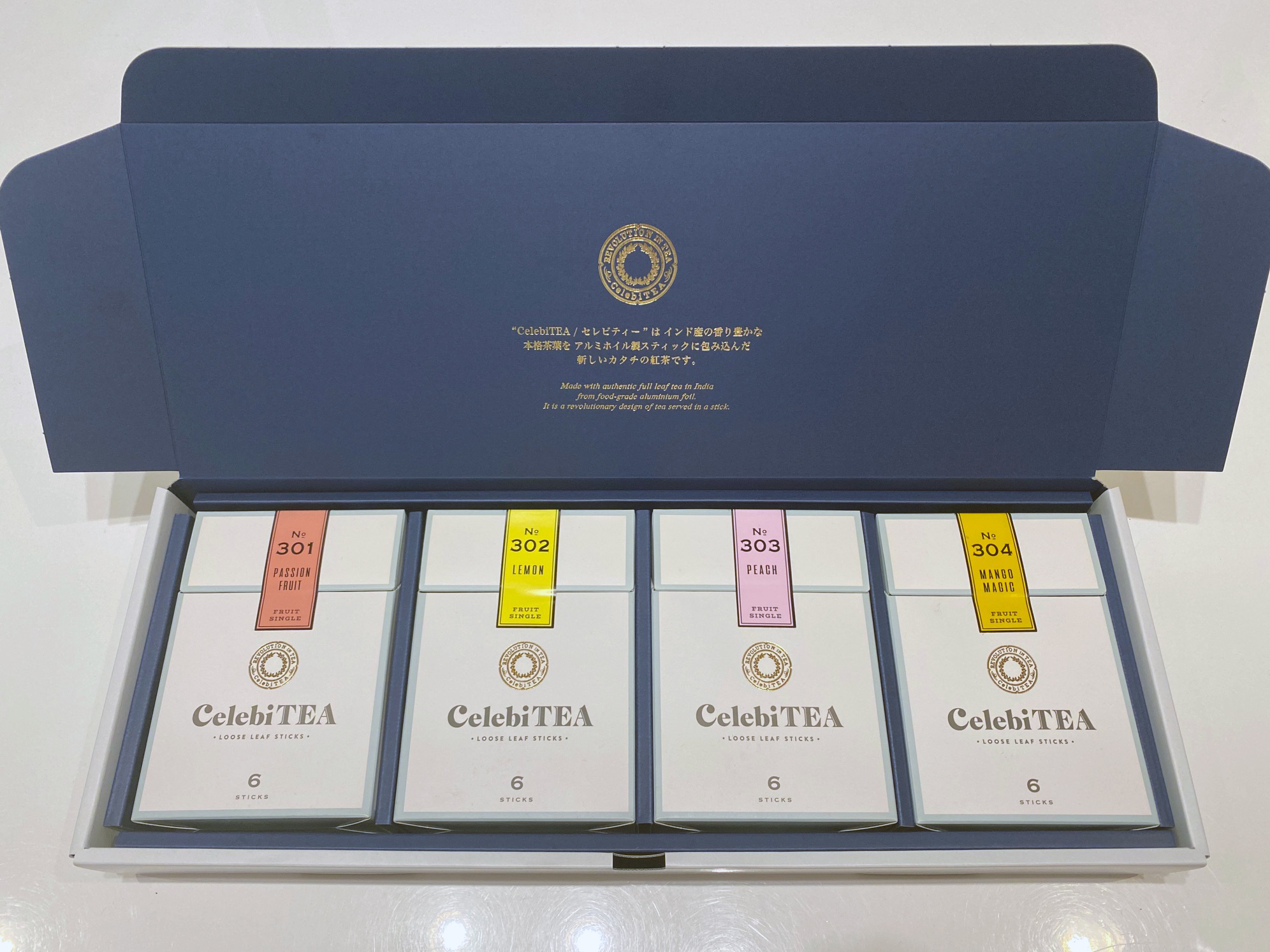 大口注文・法人のお問い合わせはこちら- Made with authentic full leaf tea in India - 【CelebiTEA(セレビティー)】はインド産の香り豊かな茶葉をアルミホイルのスティックに包み込んだ新しいタイプの紅茶です。本格的な紅茶をカジュアルに楽しむスタイルをご提案します。 ギフトボックス24(フルーツセット)は、4種類のフルーツフレーバー(No.301 パッションフルーツ、No.302 レモン、No.303 ピーチ、No.304 マンゴーマジック)をお楽しみいただけるギフトセットです。 幅広い年代の方にお楽しみいただけます。 紅茶の香りとフレーバーで癒しの時間をお過ごしください。