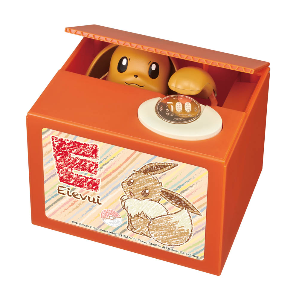 大口注文・法人のお問い合わせはこちら『イーブイ』の貯金箱です。 コインをポケモンボールのお皿に置くと、「イーブイ」が顔を出してコインを貯めてくれます。 「イーブイ」が可愛くおしゃべりしてくれます。 楽しく貯金の習慣が身に付くと話題の商品です。 特に、お子様やお孫様へのプレゼントに最適です。 もちろんピカチュウが好きな自分専用でも楽しめる商品です。 単3形アルカリ乾電池 2本使用(別売り) ※アルカリ乾電池専用 日本の硬貨専用です。 これ以外の硬貨は使用しないで下さい。 (1円、5円、10円、50円、100円、500円の現行硬貨6種)硬貨は必ず1枚ずつ入れて下さい。 硬貨は、500円玉で約40枚入りますが、コイン収納部に均等に入るように、左右に降って下さい。 対象年齢6歳以上です。