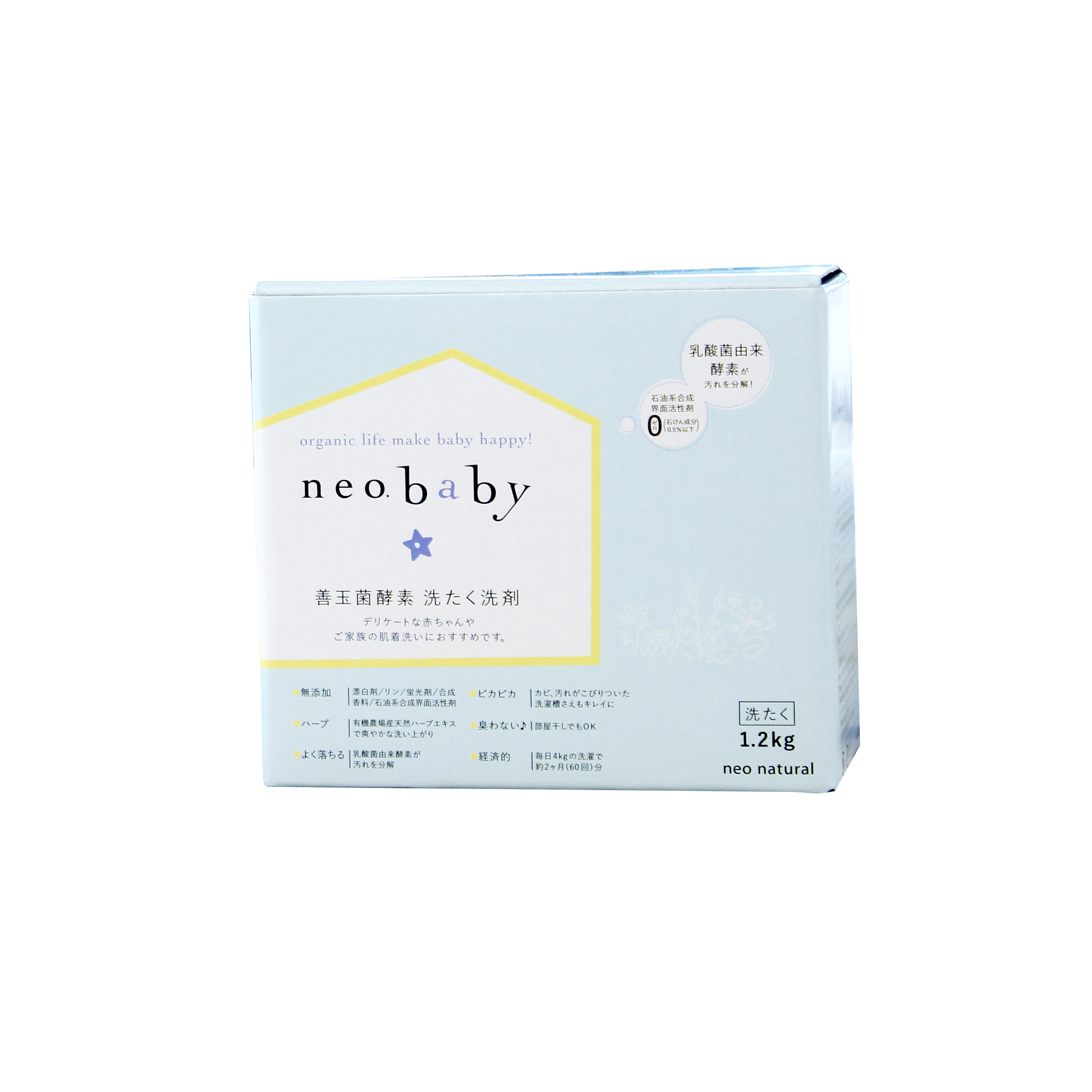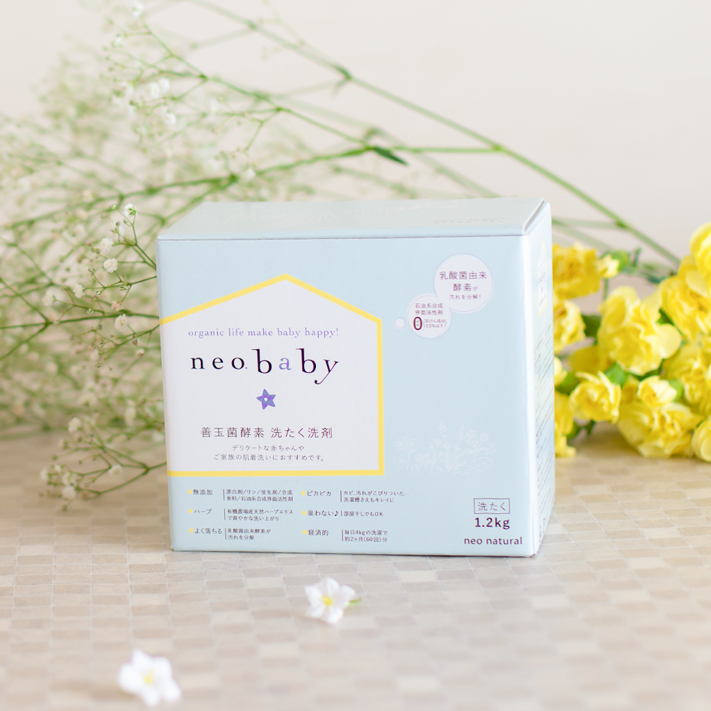 大口注文・法人のお問い合わせはこちらネオベビー洗剤は酵素を使用したエコ洗剤。 合成界面活性剤ゼロだから、赤ちゃんのお肌にもぴったりです。肌に余分なものが残留しないので、赤ちゃんといっしょに安心して使っていただけます。 また三種の酵素が汚れをしっかり落とします。