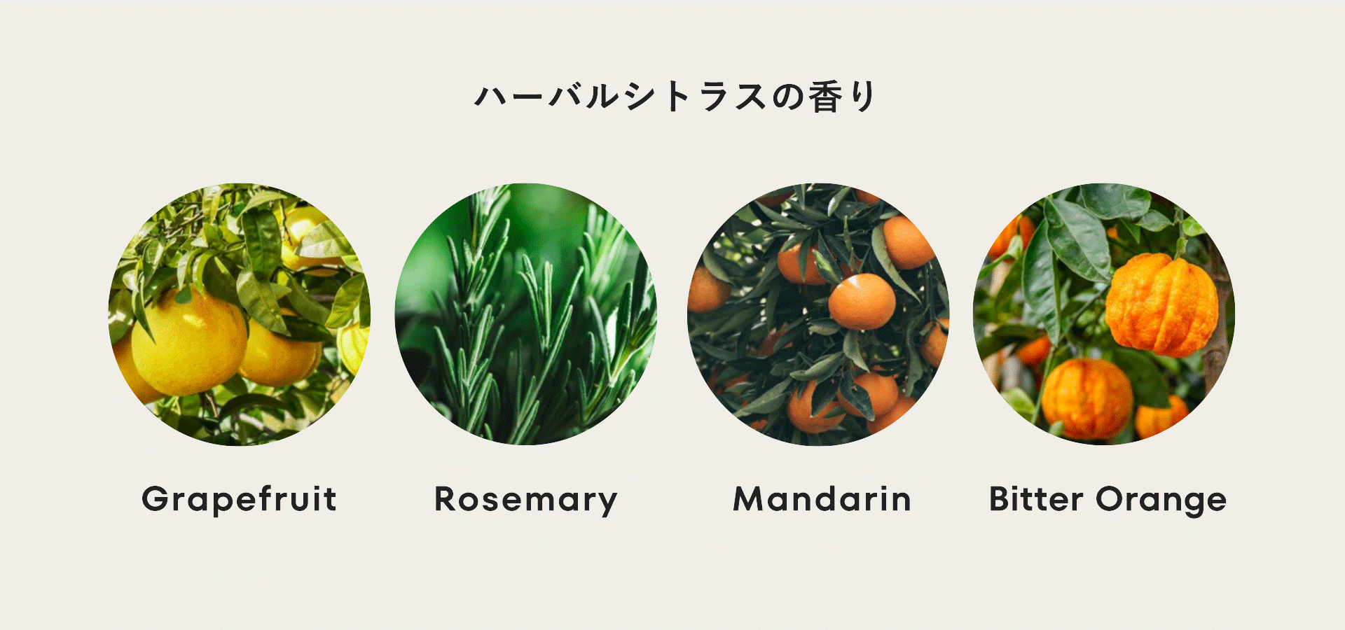 柑橘味溢れる、より爽快で心地よいハーバルシトラスの香りで忙しい毎日の気分も整えます。精油系が苦手な方も使いやすい柑橘ベースに仕上げました。