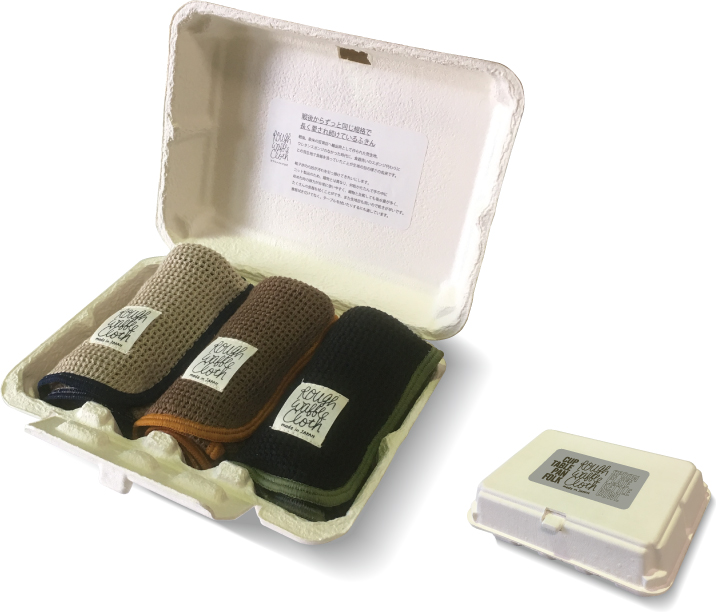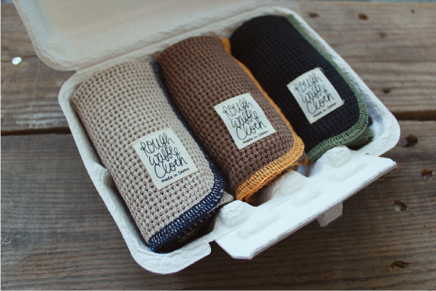 戦後からずっと同じ規格で長く愛され続けているふきんのセットです。戦後、欧米に百貨店へ輸出用として作られた粗生地。ウレタンスポンジのなかった時代に食器洗いのスポンジ代わりにこの粗生地で食器を洗っていたことが生地の目の硬さの由来です。