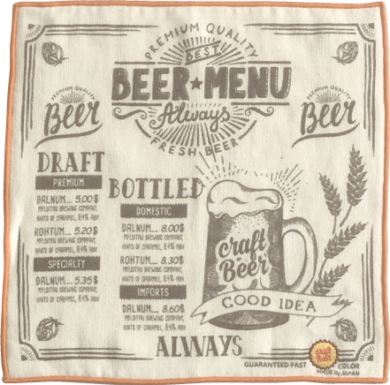 大口注文・法人のお問い合わせはこちらガーゼ、綿基布、パイルの3層構造のタオルハンカチ。 糸に撚りをかけていない無撚糸パイルを使用しているので、ふっくらと柔らかな肌触りが気持ちよく、吸水性と保湿にも優れています。裏面は無撚糸パイルとなります。 手書き風のビールメニューのイラスト、ビール瓶のフタの刺繍入りです。