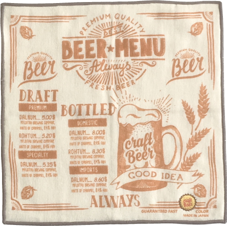 ガーゼ、綿基布、パイルの3層構造のタオルハンカチ。糸に撚りをかけていない無撚糸パイルを使用しているので、ふっくらと柔らかな肌触りが気持ちよく、吸水性と保湿にも優れています。裏面は無撚糸パイルです。手書き風のビールメニューのイラスト、ビール瓶のフタの刺繍入り。