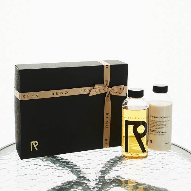 日々を彩り、優雅にいたわる。ライフスタイルブランド【RENO(リノ)】から”クロノシャルム シャンプー&トリートメントセット”をお届け。高級感のある黒いギフトボックス入りなので贈り物にもおすすめです。