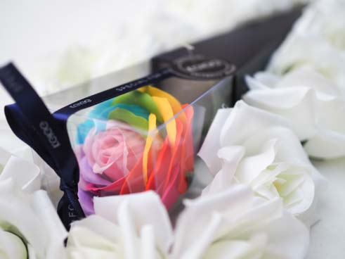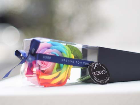 レインボーの一輪のバラ。カラフルで華やかなお花は女性へのプレゼントにぴったりです。