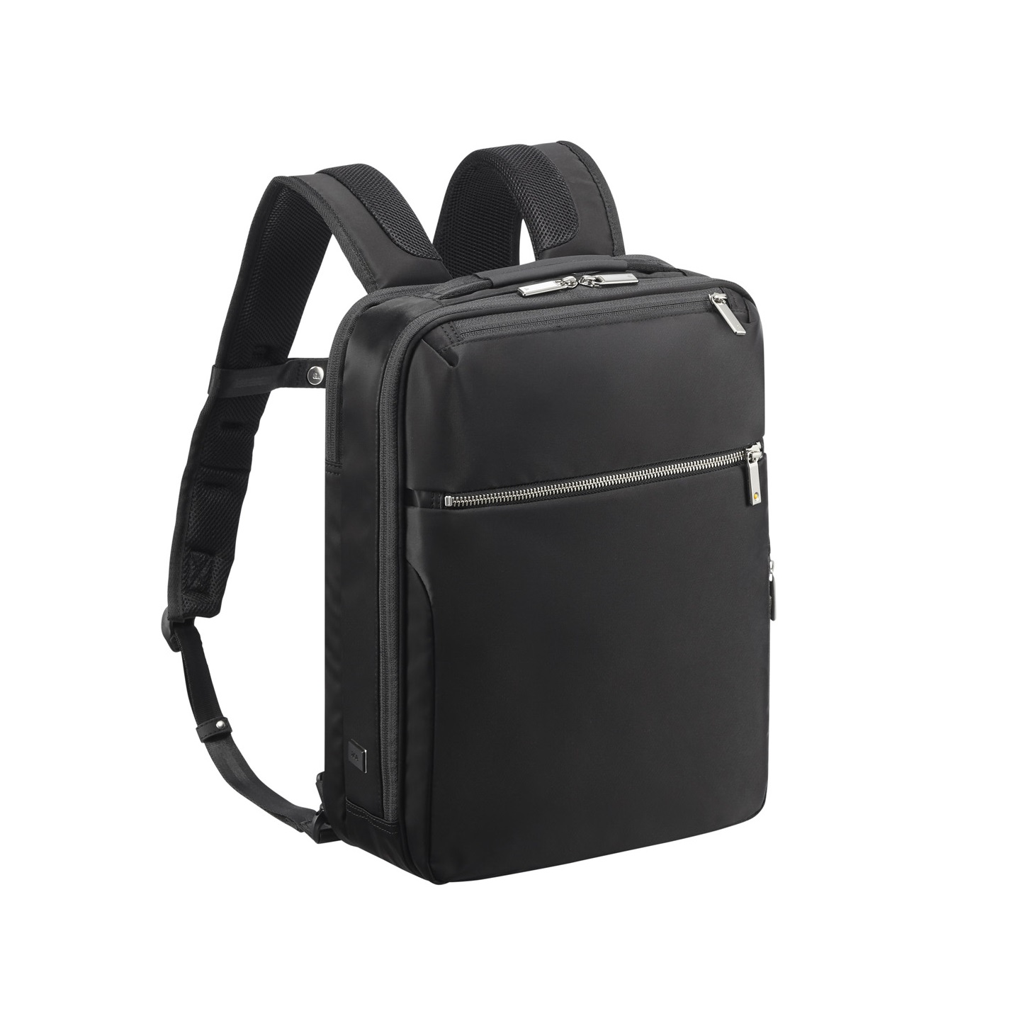 大口注文・法人のお問い合わせはこちらスリムなボディに収納力を凝縮したコンパクト設計のビジネスリュックです。 A4ファイル、ノートPC(13inch)収納対応しています。 デッドスペースになりがちなフロントトップ部分にメガネや小物を収納できるポケットを配置しています。電車で前持ちにした際にとても便利なポケット配置になっています。 トローリーバッグのハンドルバーに固定して持ち運べるセットアップ機能を搭載。