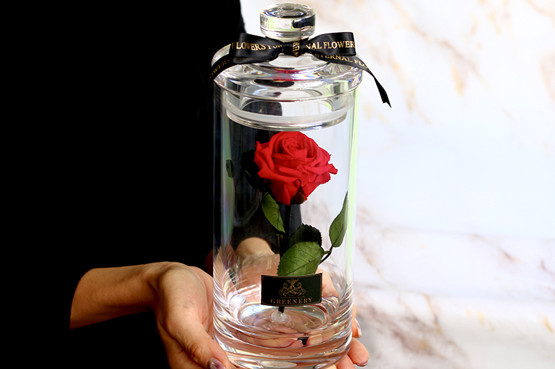 大口注文・法人のお問い合わせはこちら光の通る静かな空間に1輪のバラを閉じ込めたアートピースのようなフラワーアートです。360 度見る角度によって異なる表情を楽しめ、花本来の魅力が引き出された大胆なデザインです。 見る人の心を魅了し、記憶に残る非日常の空間を演出します。