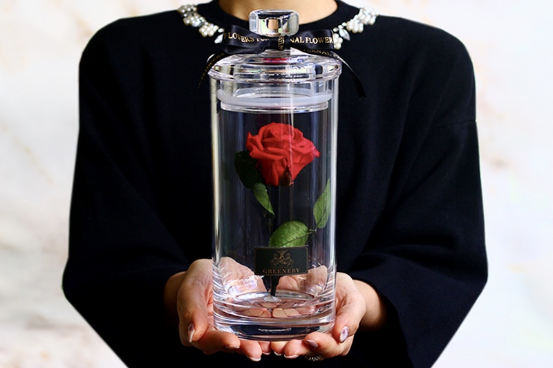 枯れることのない薔薇のプリザーブドフラワーを高級有機ガラスに入れたフラワーアートです。いつまでもきれいに飾っていただけます。 高級感のあるギフトボックスに入って、プレゼントに最適です。 特別な薔薇のフラワーアートをプレゼントしてみてはいかがでしょうか。